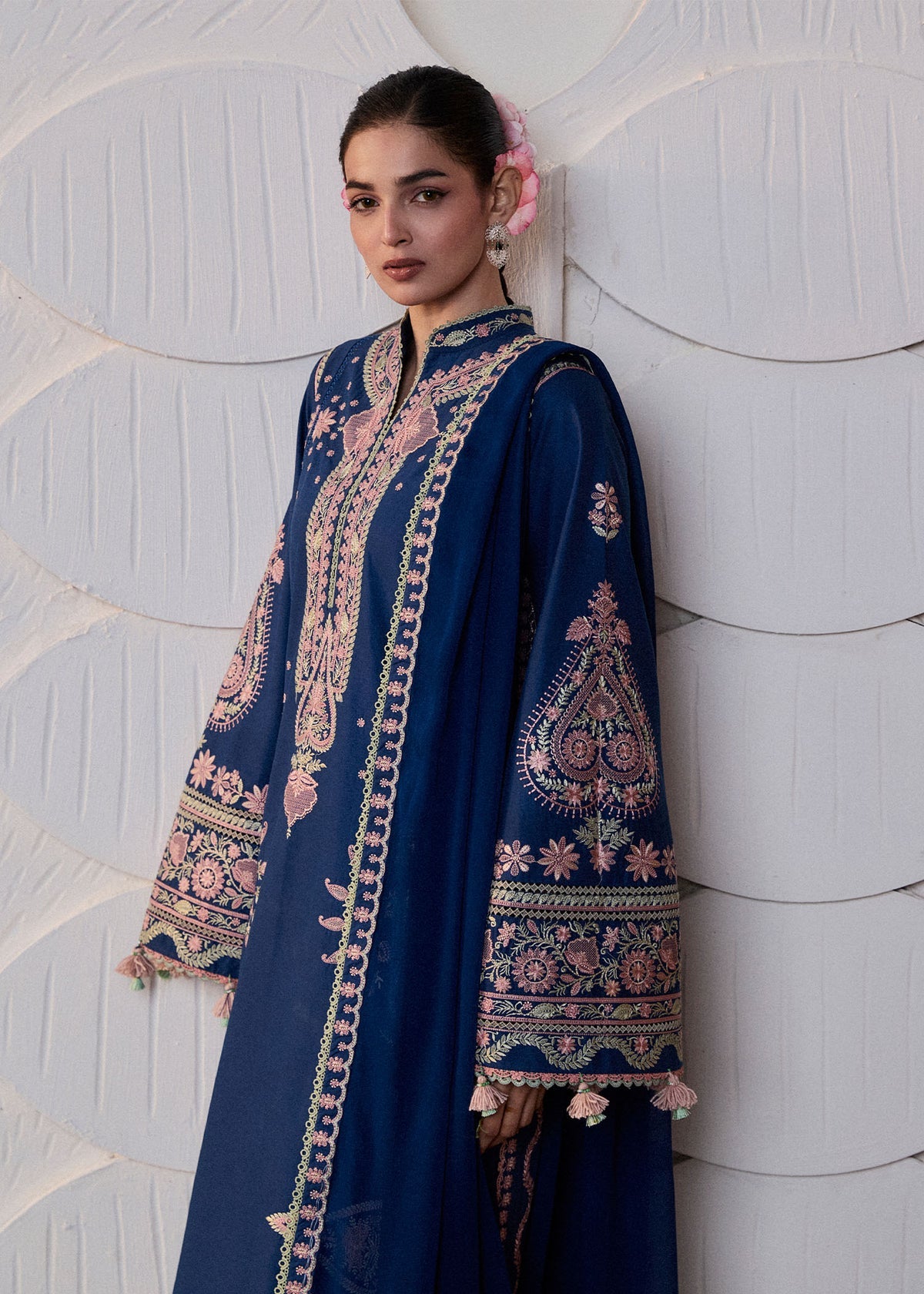 An elegant ink blue ensemble, thoughtfully designed with a minimalistic aesthetic, makes a timeless choice for the festive season. Adorned with vibrant, delicately crafted embroidery that stands out beautifully against the deep base, the piece exudes richness and refined charm. It is paired with a matching chiffon dupatta, intricately embroidered in coordinating hues, completing the look with graceful harmony.