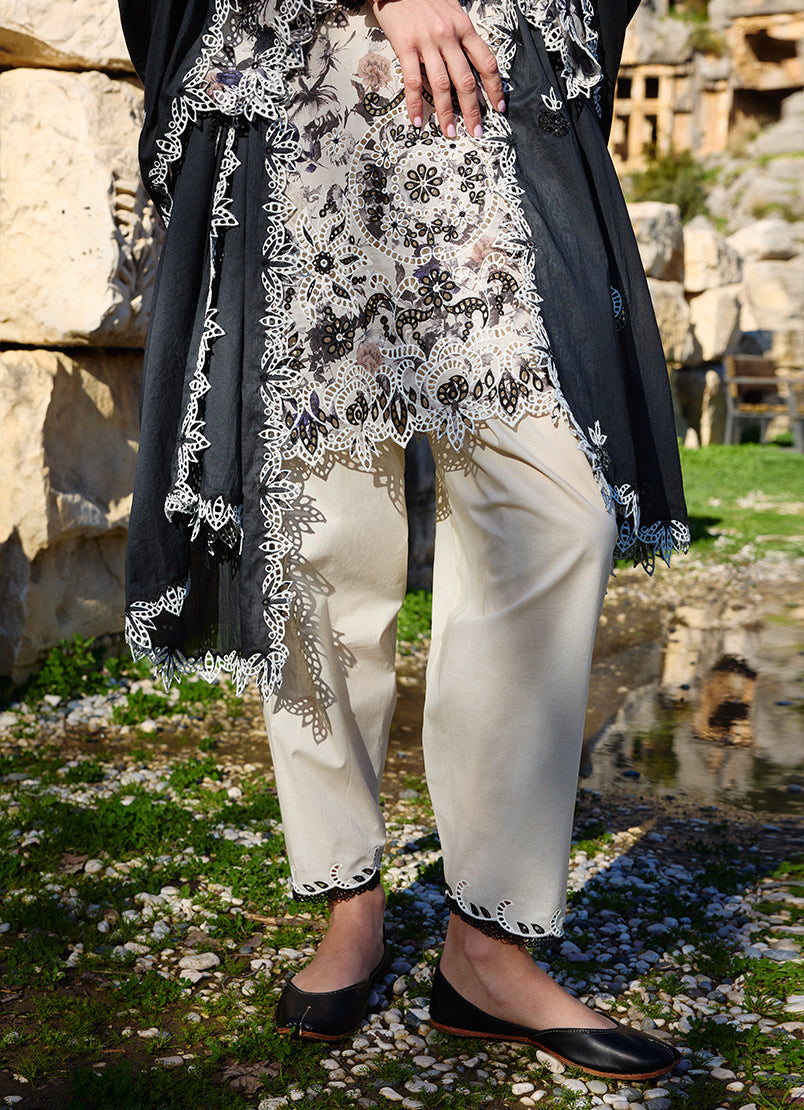 Perihan in Ivory from our Spring Printkari '25 Collection. A printed cutwork embroidered cotton 3-piece outfit paired with dyed voile embroidered dupatta.