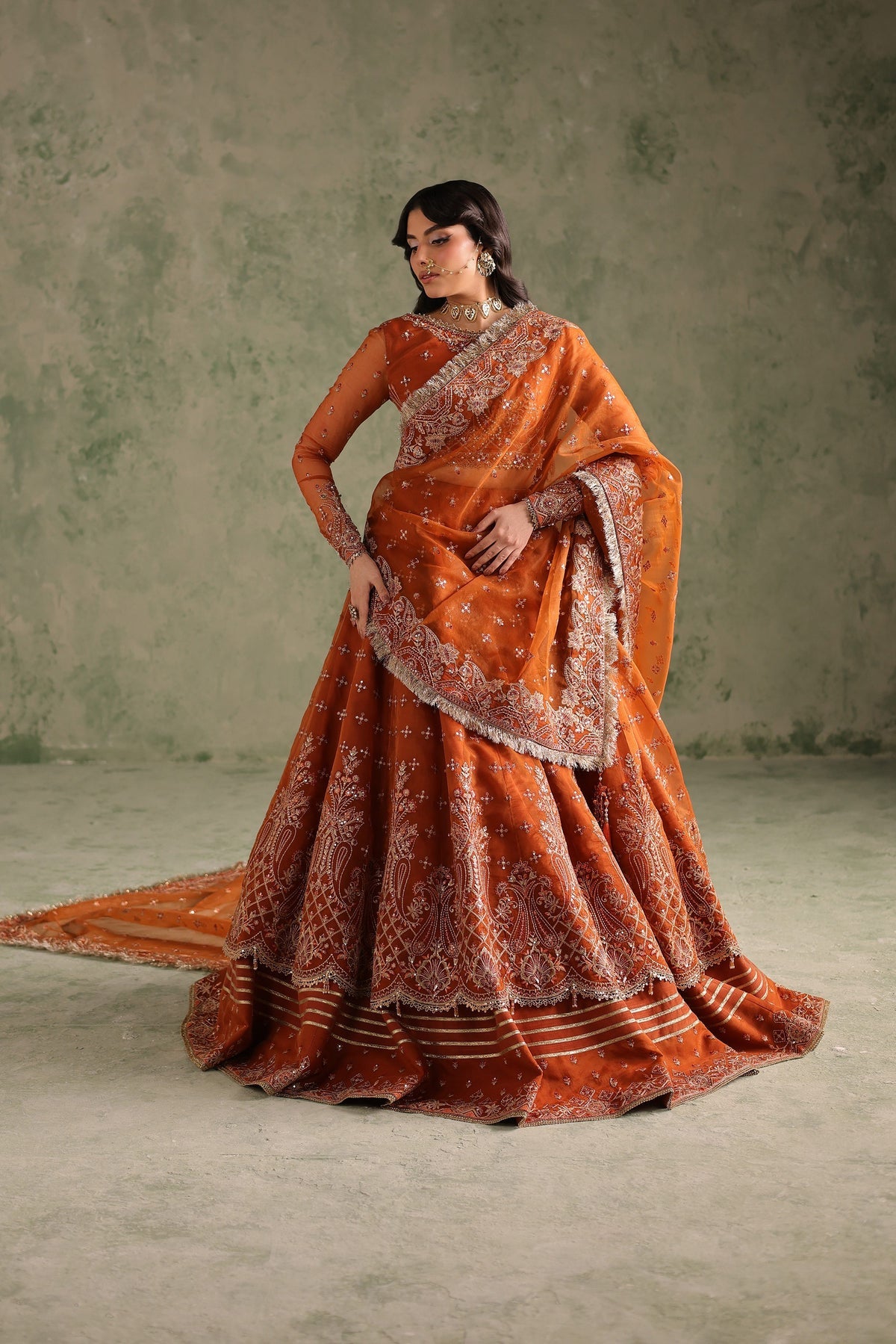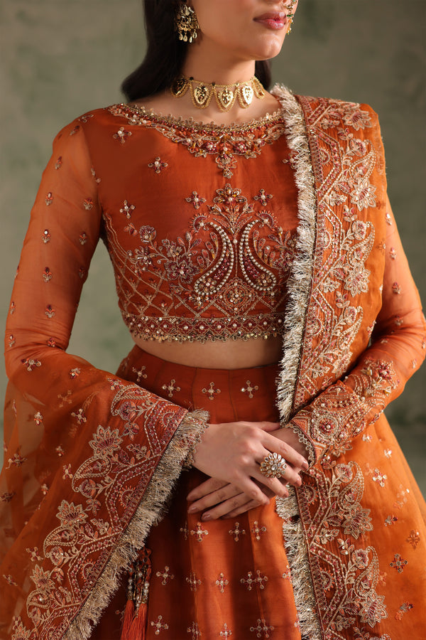 This regal organza and raw silk maxi featuring hand-embellished bodice and sleeves, 18 embroidered lehenga panels and a 2.75-yard dupatta. Adorned with a mix of kulfi, drops, bethki, Japanese cut dana, kanch moti, pearls, crystals, and sitara, this dress is a stunning display of intricate handwork. Each embellishment is carefully placed to create a radiant, luxurious finish, adding depth, sparkle, and timeless elegance to the outfit. Perfect for special occasions, the embellishments highlight the artistry and craftsmanship behind every detail.