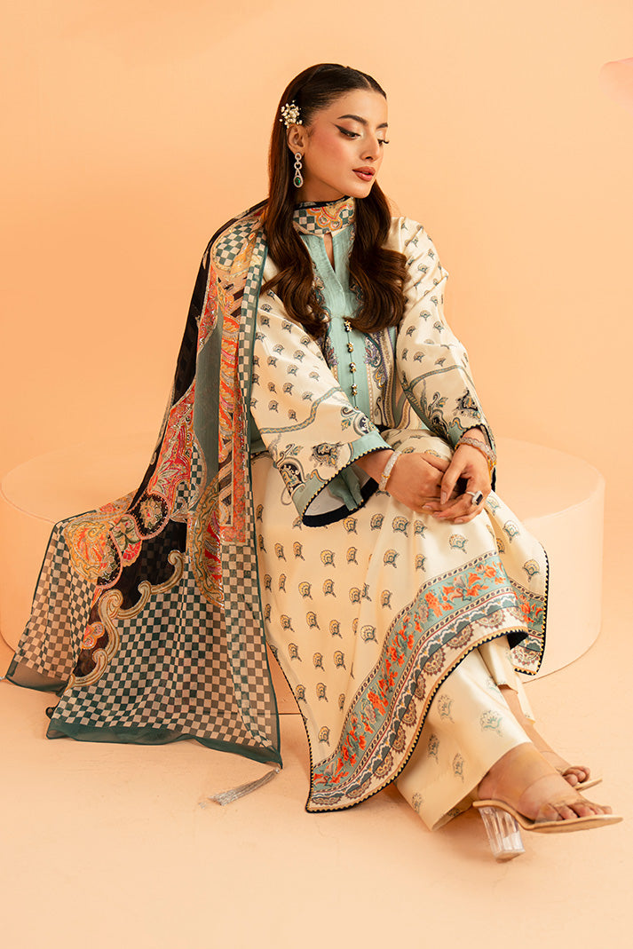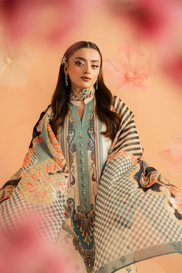 Verdant Élan features a digitally printed silk shirt designed with intricate motifs and refined detailing. The smooth printed silk trouser complements the composition perfectly, ensuring comfort with sophistication. Finished with a printed chiffon dupatta that flows effortlessly, this outfit blends elegance with contemporary appeal.
