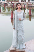 Aabshaar is a breathtaking aqua color bridal dress inspired by the fluid beauty and freshness of cascading water. The front is crafted from embroidered net, enhanced with striking 3D work that adds dimensional depth and modern allure. A finely detailed embroidered organza front-neck design, adorned with handmade embellishments, creates a captivating focal point.