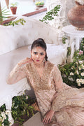 Meherbano is a tender and romantic bridal dress in peach colour, designed to celebrate warmth and elegance. The front yoke is crafted from embroidered net and adorned with delicate handmade embellishments, beautifully paired with matching back yoke and panels for a harmonious silhouette. Organza borders accent the yoke and panels, adding refined structure and sophistication.