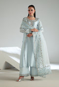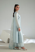 Step into a dream with our exquisite "Mist" ensemble . This sheesha silk shirt is a vision, featuring a dazzling jewelled neckline and sleeve edges intricately hand-worked with dabka, crystals, and genuine Swarovski elements. The front cuts sparkle with extra sequin and crystal embellishments, perfectly complementing the side slits. Paired with chic loose pants boasting a heavily embellished border and a flowing organza dupatta, this look is pure luxury.
