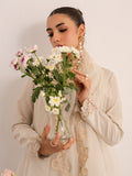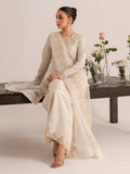 Softly radiant and effortlessly refined, Creme from The Silk Chapter is an ode to timeless minimalism. Crafted in a graceful off-white raw silk, the shirt front features delicate embroidery along the neckline and border. The plain sleeves are finished with a subtle embroidered trim, while the back and trousers remain clean and structured. A breezy organza dupatta, finely embroidered, completes the look with a sense of lightness and grace.