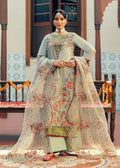 Step into timeless grace with our sage green chiffon long shirt, adorned with intricate multicolor embroidery and embellished with delicate pearls and tassel details along the neckline. Paired with a scalloped organza dupatta, richly embroidered to enhance its beauty, and classic PK raw silk pants, this ensemble captures a perfect blend of elegance and sophistication. Ideal for weddings and festive gatherings, "Sage Elegance" exudes refined charm, celebrating Jamni’s commitment to luxury and tradition.
