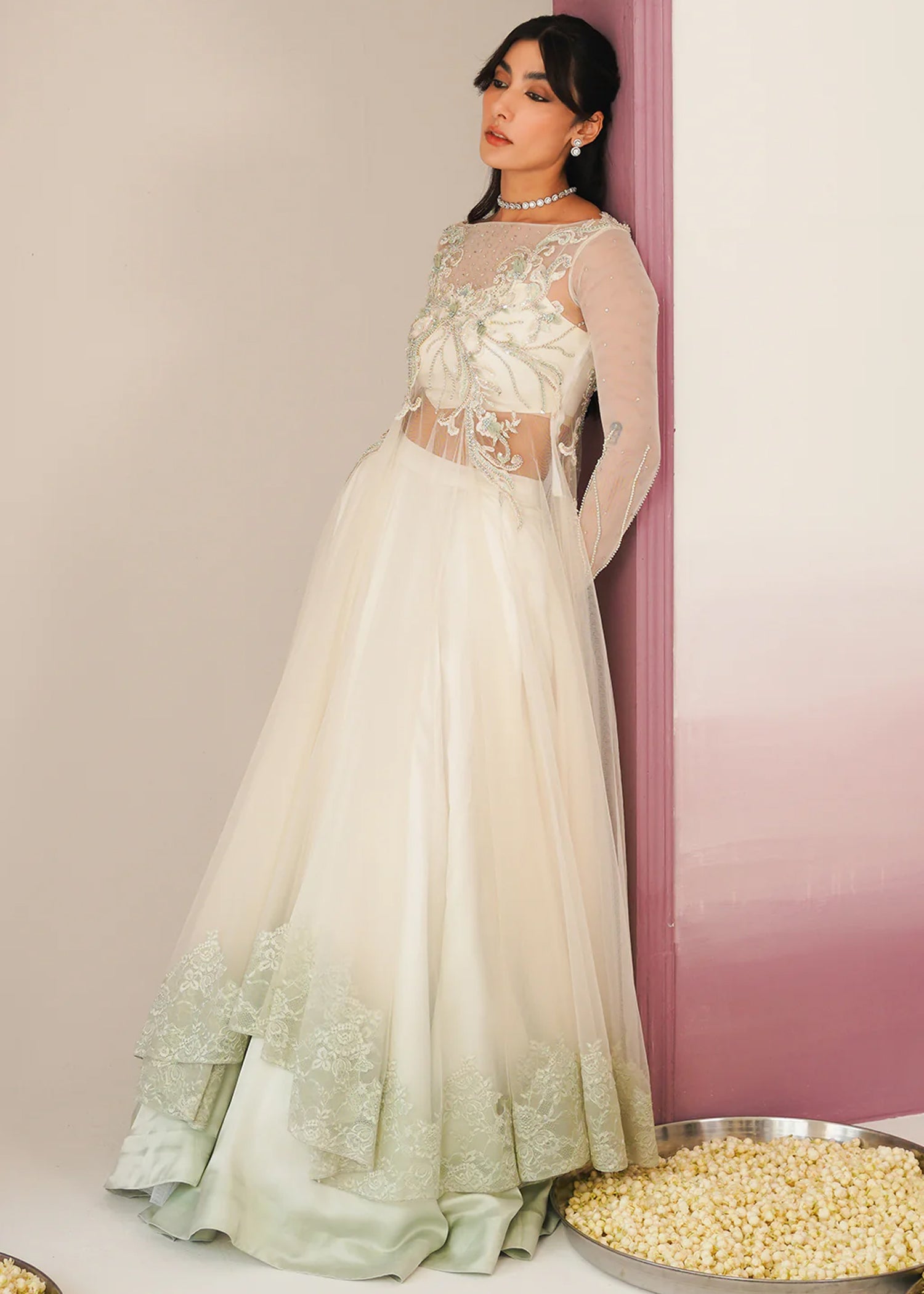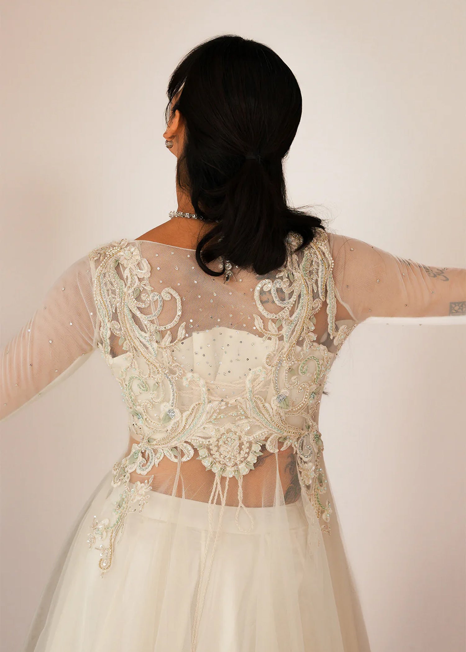 Given our Pakistani cultural background, we understand the significance of modesty. Therefore, we may make adjustments to certain design elements for modesty reasons. Examples of modifications include transforming low backs into traditionally styled regular backs, replacing drop shoulders with normal shoulders, concealing exposed stomachs, and attaching sleeves to sleeveless dresses.