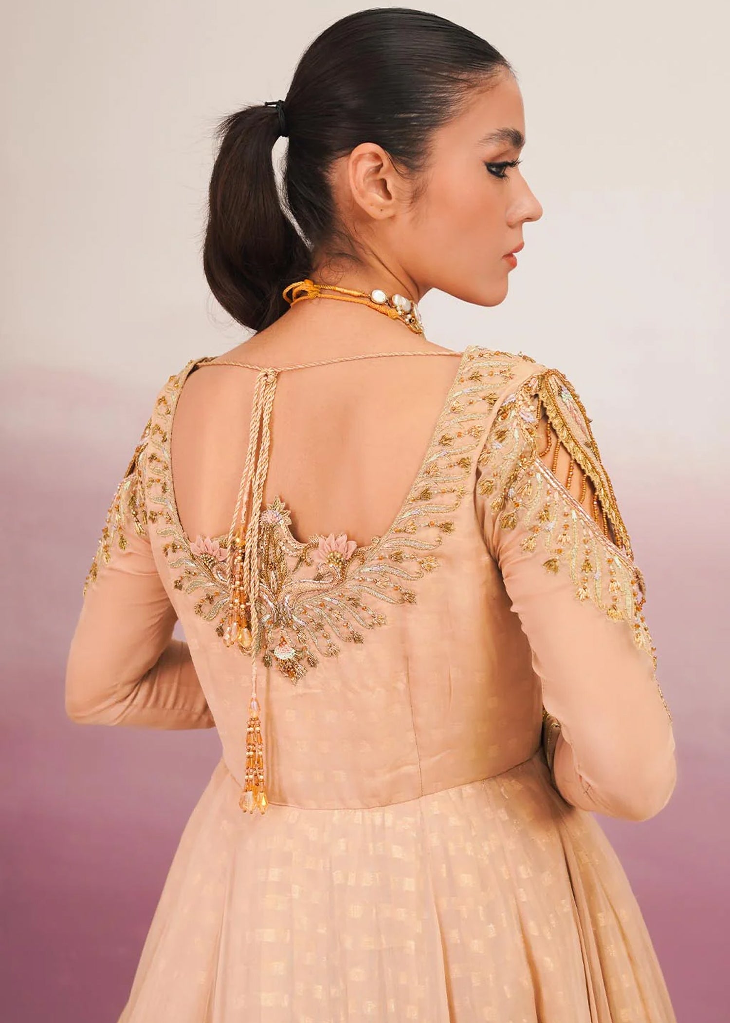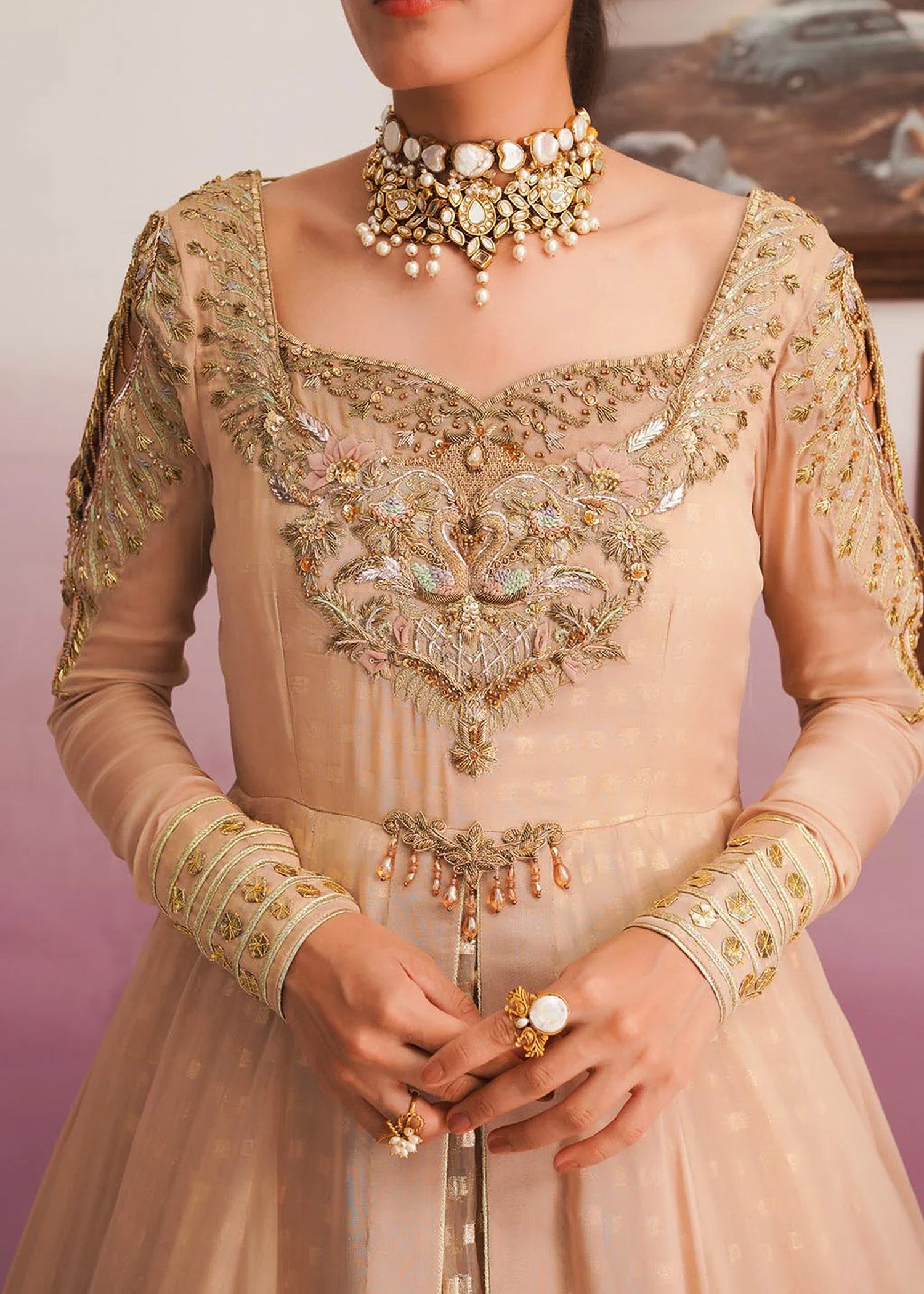 Paper chiffon skin canvas with detailed couture neckline and sleve cut work detail and gotta work spray at the bottom of peshwaz with scalloped hem lined with organza tinsel .10""low back with cutwork detail and and Dori tassels at the back. '' 60 Length''