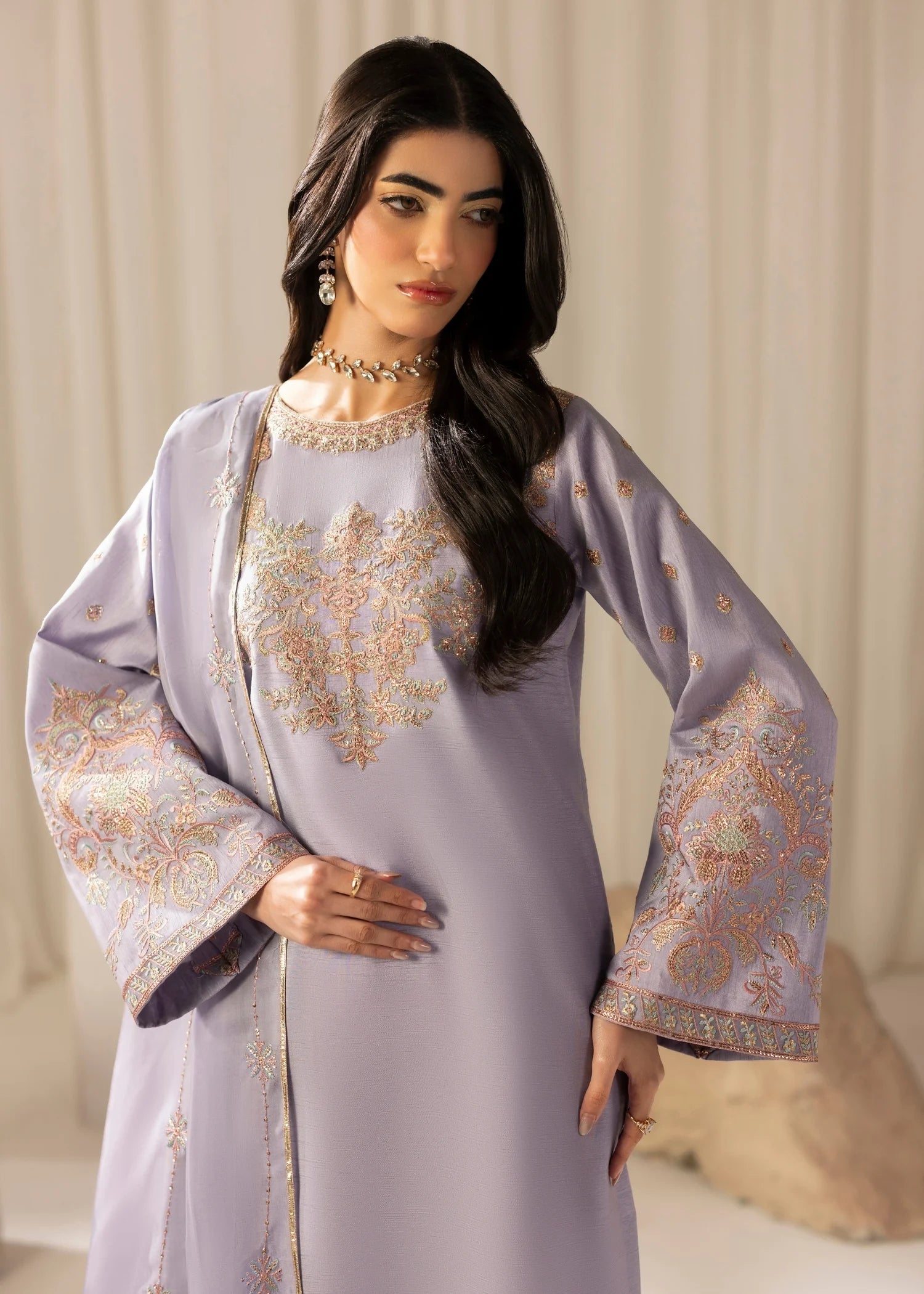 Embroidered Korean silk long shirt with pink and blue hues, along with rose gold bling. Embroidered loose sleeves, paired with A-shaped pants with embroidered hem border.