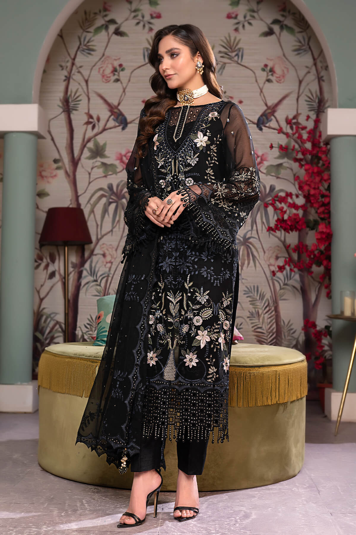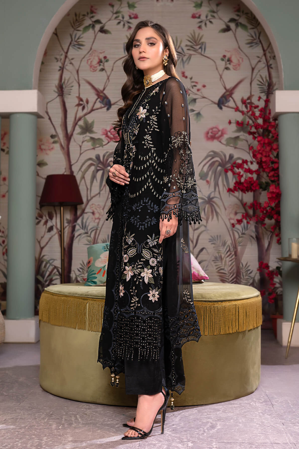 Given our Pakistani cultural background, we understand the significance of modesty. Therefore, we may make adjustments to certain design elements for modesty reasons. Examples of modifications include transforming low backs into traditionally styled regular backs, replacing drop shoulders with normal shoulders, concealing exposed stomachs, and attaching sleeves to sleeveless dresses.