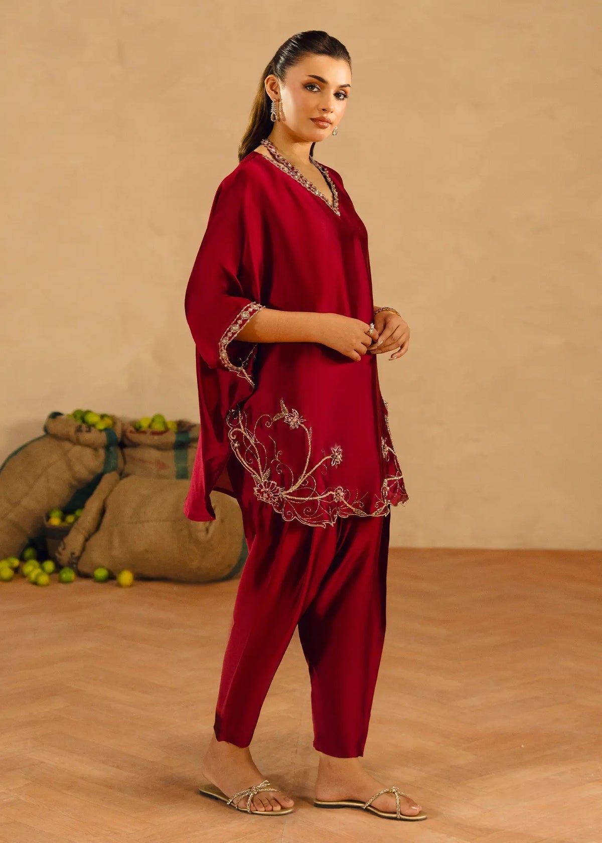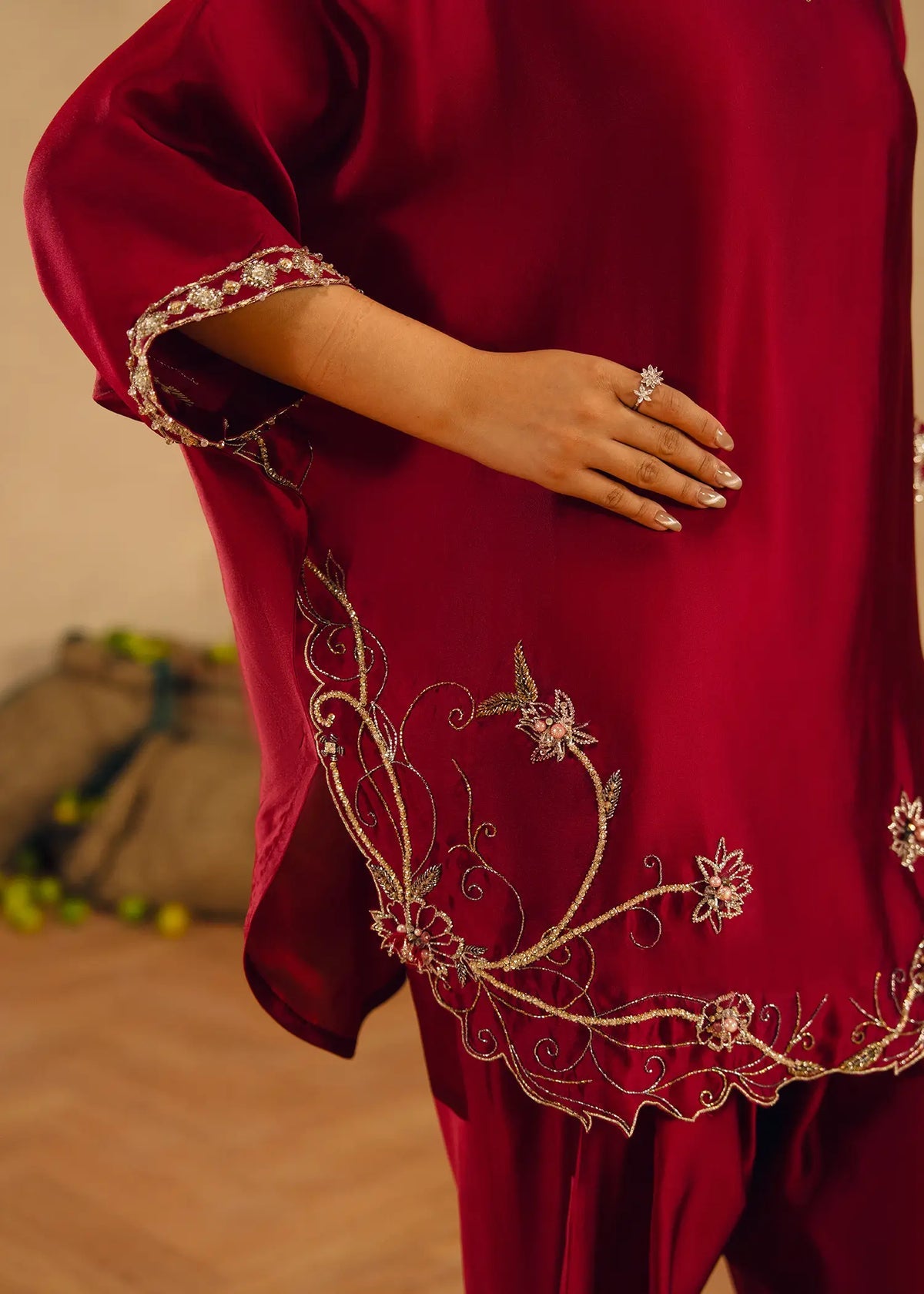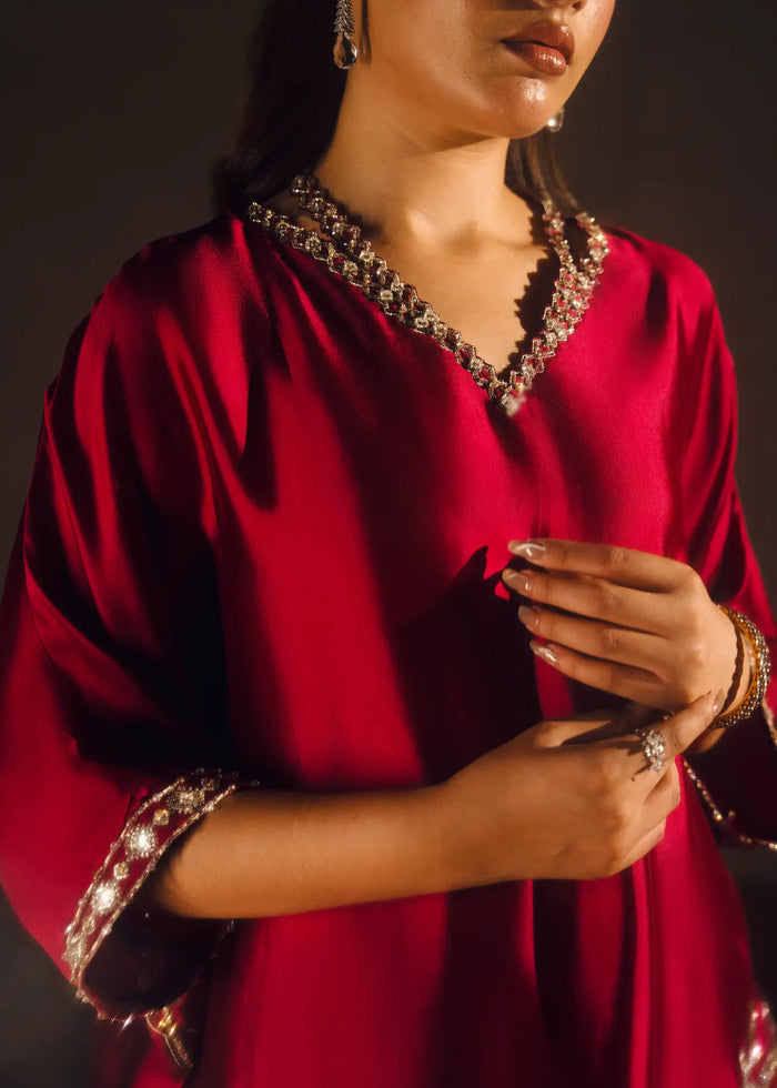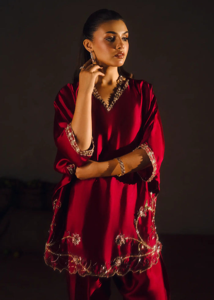 The Elara silk shirt boasts elegant bat sleeves beautifully adorned with Swarovskis and intricate dabka and cut daana embellishments, showcasing exquisite craftsmanship. The skinny shalwar adds a modern touch, offering grace. Paired with a scalloped dupatta that adds a layer of refinement, this ensemble is perfect for making an elegant impression at any event.