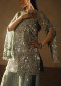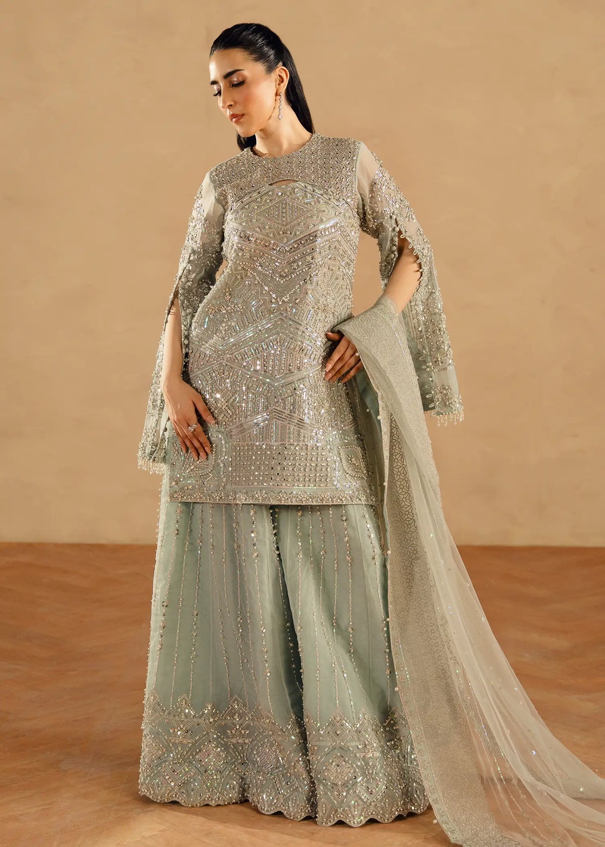 Syra radiates grace in this breath taking JEEM creation - a masterpiece of intricate craftsmanship. Iris Blue has an embroidered organza shirt and sharara embellished with pearl, sitara, cutdana, stones and Swarovskis. It is paired with a tulle net dupatta to add a touch of elegance.