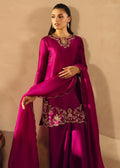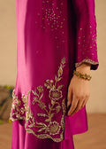 Magenta Marl is a delicate silk set, adorned with vibrant zardozi floral embroidery, gold sequins accents, finished with scalloped embellishments at the hem and sleeves. The shirts keyhole neckline is embellished along with the scalloped culottes. Paired with a scalloped pure organza dupatta with delicate tilla trims.