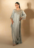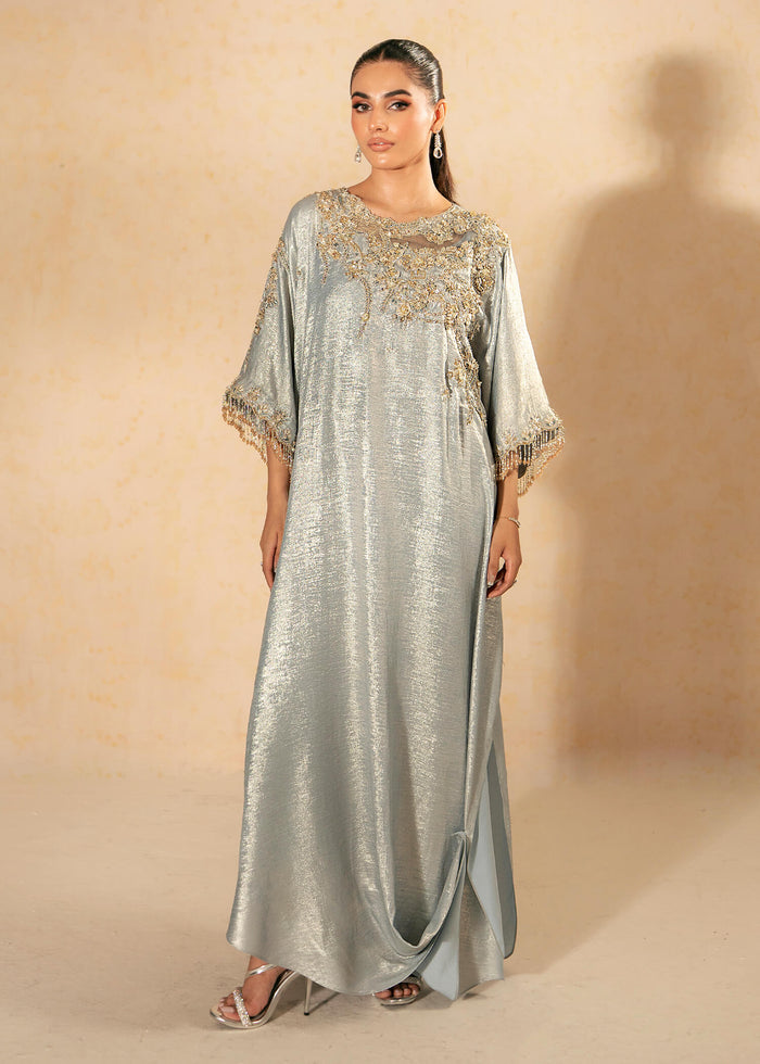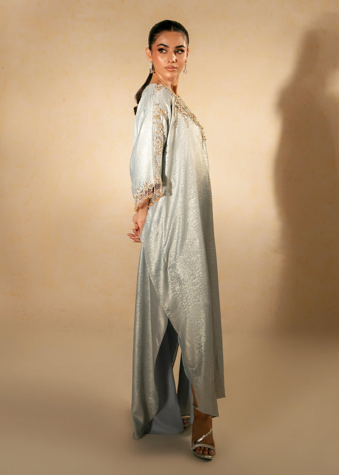 Introducing our elegant Aqua Cloud ensemble featuring a shimmer silk floor-length asymmetrical shirt. Adorned with intricate resham, crystal and pearl work embellishments and complemented by a cowled hemline; the Aqua Cloud ensemble is paired with straight pants for a perfect blend of sophistication and charm.