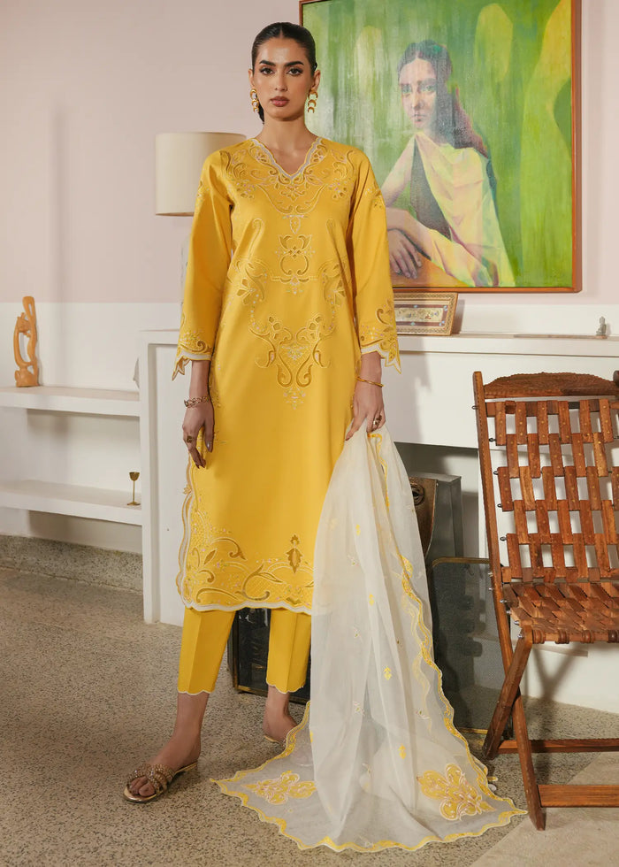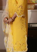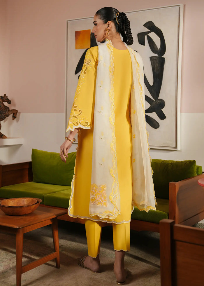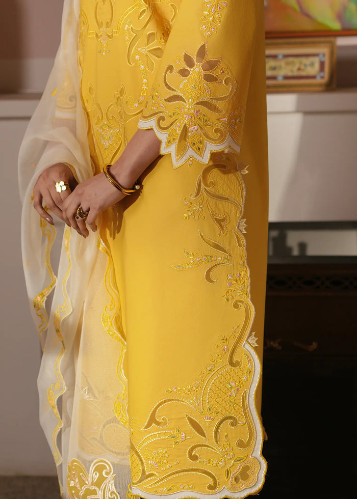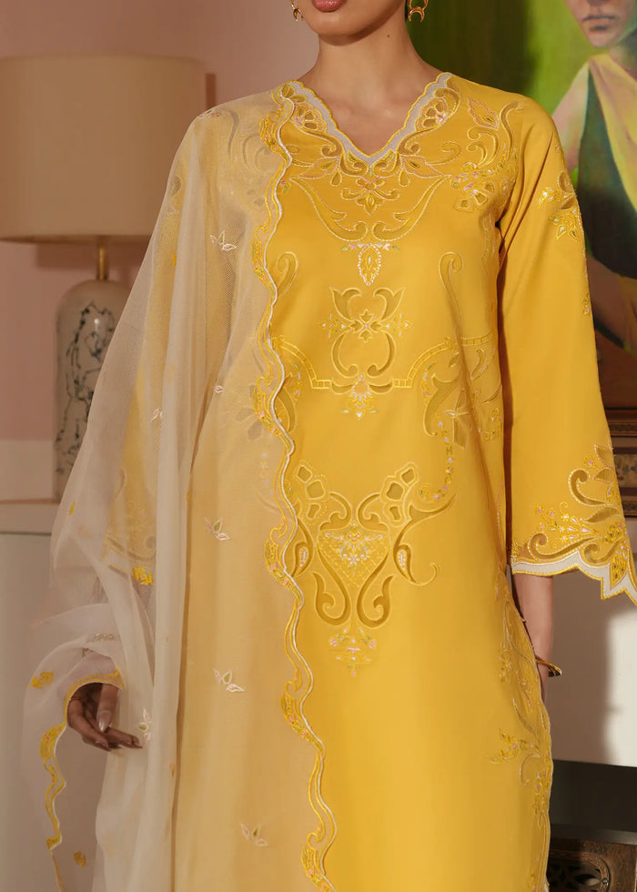 A perfect blend of sophistication and charm, Sunflare is a three-piece lawn ensemble. The yellow lawn shirt is adorned with resham embroidery, organza laser-cut detailing, and delicate patchwork accents. It is paired with a cotton cambric trouser and a self-organza dupatta featuring intricate organza patchwork and elegant scallop detailing, adding a soft yet elevated finish to the overall look.