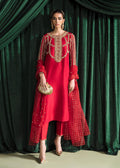 Charisma, a pure raw silk ensemble is a stunning work of art that is sure to turn heads and make a statement. The pure raw silk fabric with a subtle sheen that adds depth and texture to the overall design. Its bold red hue is both classic and eye-catching, evoking a sense of power and confidence. The shirt is adorned with a beautiful hand-embellished neckline in antique gold, which adds a touch of opulence and elegance, the sleeves are beautifully embellished with charmeuse and organza linear patches. To complete the look, the ensemble is paired with an organza dupatta, which adds a touch of femininity and softness.