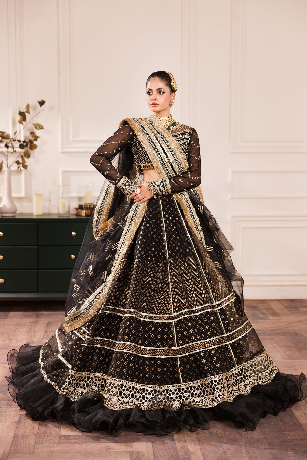 Given our Pakistani cultural background, we understand the significance of modesty. Therefore, we may make adjustments to certain design elements for modesty reasons. Examples of modifications include transforming low backs into traditionally styled regular backs, replacing drop shoulders with normal shoulders, concealing exposed stomachs, and attaching sleeves to sleeveless dresses.