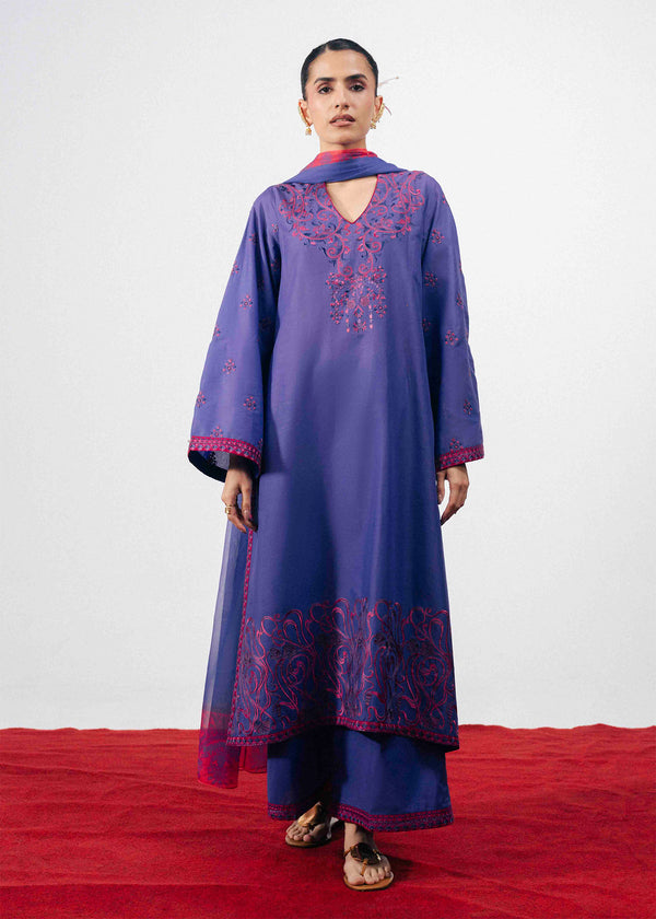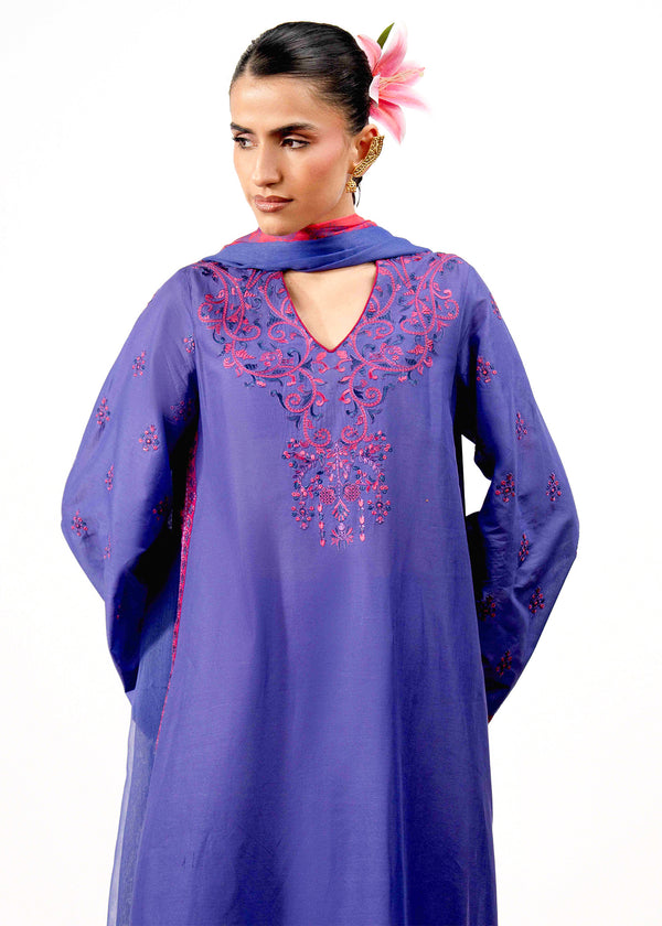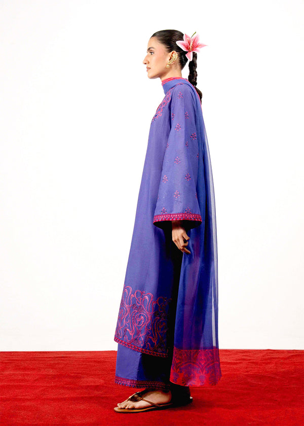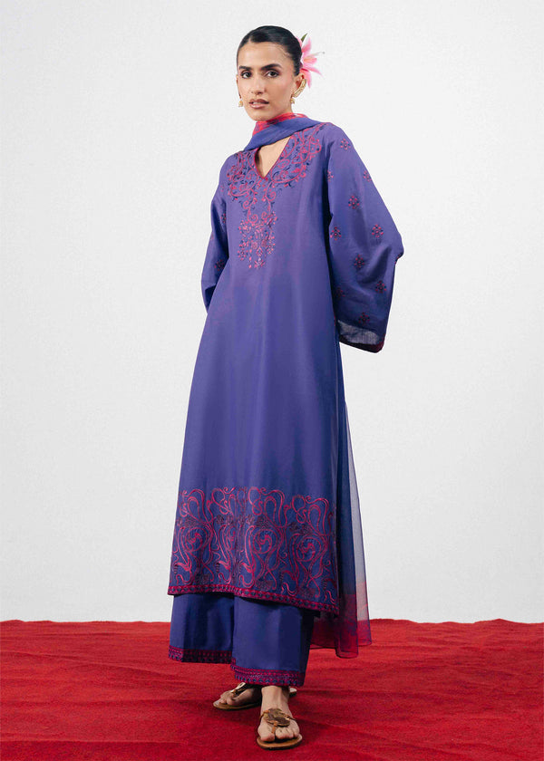The outfit features a purple kurta accented with intricate pink embroidery across the neckline, sleeves, and hem. The flowing silhouette is enhanced with a contrasting pink appliqué patti along the side, paired with matching trousers and a coordinating printed chiffon dupatta.