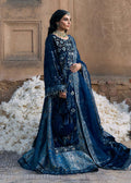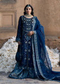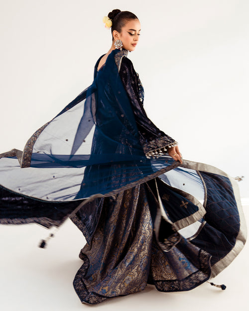 A refined blue shimmer velvet shirt adorned with intricate blue and grey hand embroidery, featuring delicate motifs crafted from micro-sequins, crystal-cut beads, white stones, tilla work, and dabka naqshi. Paired with cloud-blue jamawar pants, detailed with a velvet patti for added elegance. The ensemble is completed by a blue organza dupatta, boasting a heavily embroidered pallu and cornered with handmade tassels, creating artisanal charm.