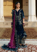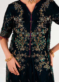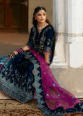 An exquisitely embroidered long shirt on a rich teal velvet base, adorned with crystal-cut beads, tilla work, and shimmering sequins. The front is accented by handcrafted buttons, while the sleeves feature intricate embroidery and cascading tassels. Paired with jamawar azaar pants, detailed with a teal velvet embroidered patti and finished with magenta accents. The ensemble is completed by a magenta organza dupatta, featuring a blue velvet pallu, delicately embellished with teal sequins, tilla thread, and a cutwork border—creating a striking balance of elegance and color.