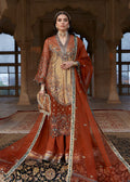 A rust-toned organza full-length shirt featuring a gold shimmer shamose panel on the front, meticulously handworked with crystals and stones, and completed with elegant organza sleeves. Paired with flowy raw silk pants adorned with gold embroidery and a shimmer patti. The look is elevated by an orange organza dupatta, highlighted by an embroidered cutwork pallu and a gold shimmer patti with intricate teal detailing.