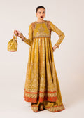 A floor-length lime peshwaz crafted from luxurious karandi fabric, adorned with radiant square cutwork around the shoulders. The design highlights a crescent-shaped motif in delicate white and silver threadwork, elegantly embellished with stones and dabka, and edged with a touch of orange for contrast. Full sleeves feature intricate gota work, while the ensemble is paired with flared azaar pants, accented by orange trims and gold embroidery. The look is completed by a slightly darker organza dupatta, showcasing a richly embroidered pallu with an orange base, adding a refined, opulent finish.