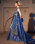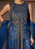 Islen exudes charm with its front-open shirt in vibrant blue organza, adorned with delicate tassel details and intricate sequence work. Paired seamlessly with jamawar sharara pants and a organza dupatta featuring rich heavy borders, this ensemble epitomizes elegance and allure