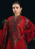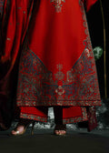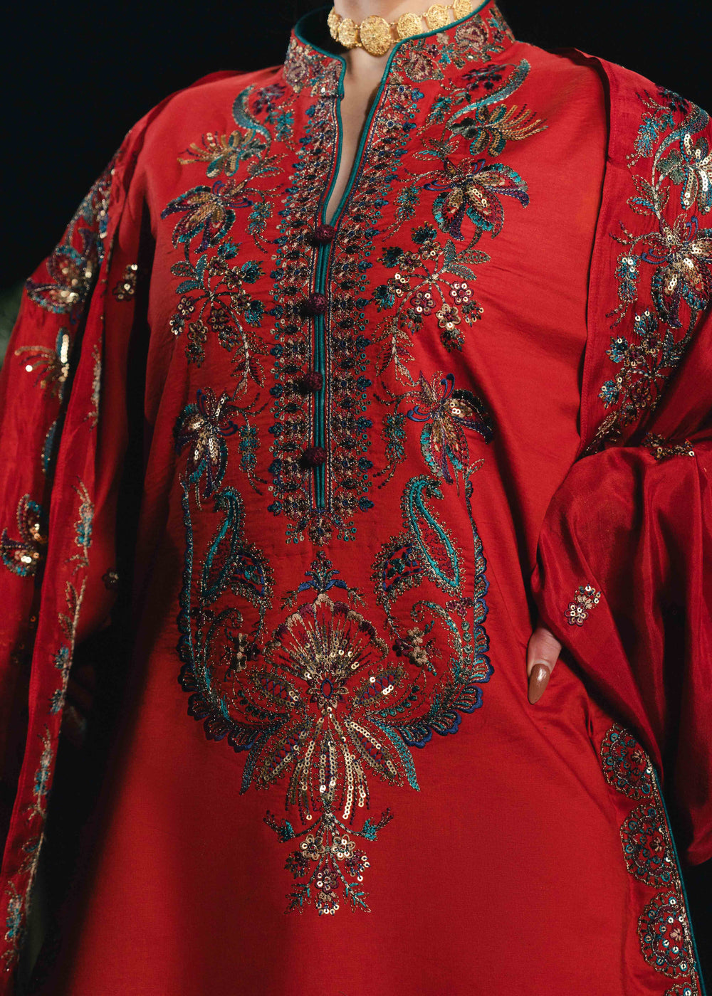 This regal crimson ensemble features a straight-cut kurta adorned with intricate antique gold and teal embroidery along the neckline, sleeves, and hem, paired with matching trousers and a richly detailed dupatta