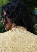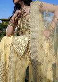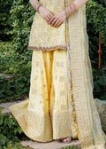 A dreamy butter yellow outfit that radiates elegance and festivity. The mid-length, straight-cut kameez is adorned with intricate golden gota dabka and cutdana handwork featuring delicate floral motifs and striking geometric patterns, adding both softness and structure to the design, paired with wide-legged Sharara pants that carry scattered embellishments and a heavily embroidered geometric hemline. A sheer dupatta with sequined accents and an ornate border ties the ensemble together with a soft, ethereal finish.