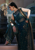 A sophisticated teal ensemble that balances modern elegance with heritage charm. The straight-cut kameez, detailed with sheer organza panels at the waist and neckline, is embellished with sequined florals and intricate thread embroidery. It is paired with tailored trousers featuring a subtle jacquard-inspired pattern, adding depth and richness to the look. A sheer golden dupatta with ornate embroidery and sequins completes the ensemble.