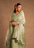 An ethereal Lakhnawi organza kurta adorned with intricate handworked detailing and a delicately embellished Mukesh neckline. Paired with a matching organza dupatta featuring hand embroidery and shimmering Mukesh accents, and grounded by tailored raw silk bottoms—this ensemble is an ode to heritage craftsmanship and timeless grace.