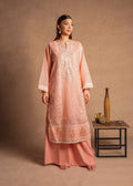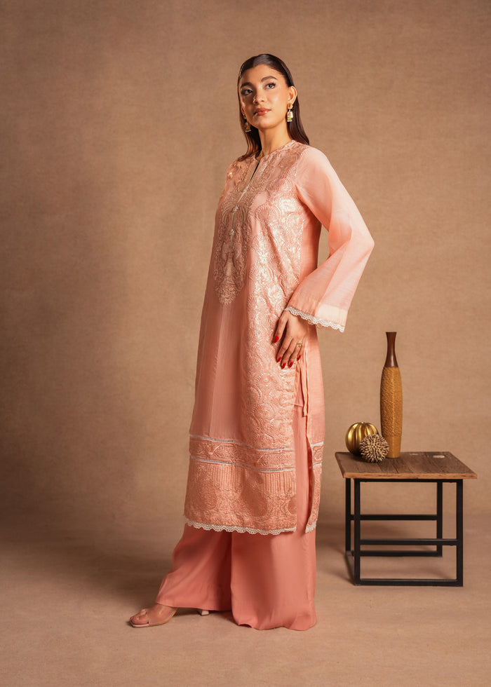 A beautifully embroidered lawn shirt in a soft coral hue, featuring intricate threadwork and scalloped lace detailing at the hem and sleeves. Paired with fluid raw silk trousers, this look is equal parts graceful and festive—perfect for daytime gatherings and intimate celebrations.