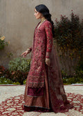 A pink-maroon karandi shirt, showcasing intricate handworked maroon embroidery with baitki and crystal-cut beads. The neckline is adorned with mirror-cut diamond motifs that extend down the length of the ensemble, accompanied by double-edged sleeves for added detail. Paired with gold-maroon jamawar pants, accented with a velvet patti for a refined touch. The look is completed with a zari net dupatta, featuring maroon embroidery, and a rich organza pallu lavishly embellished with gold sequins.