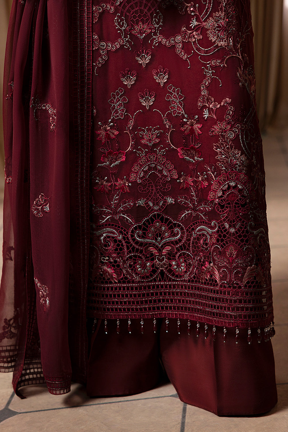 We at Khanum Jan are pleased to offer our customers a premium sewing service that prioritizes impeccable sewing styles and exceptional quality. Our team meticulously plans and sews dresses according to the brand shoots displayed on our website. However, it is important to note that brands often showcase certain design elements for illustrative purposes only, which may not be included in our dresses. Consequently, customers should anticipate minimal variations.