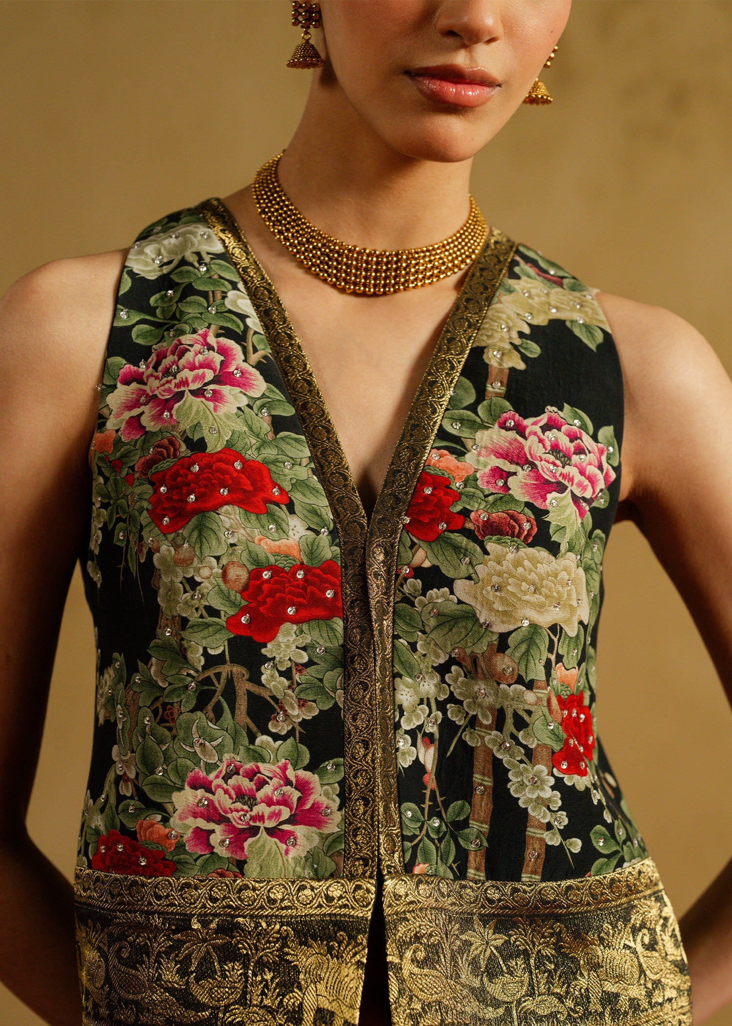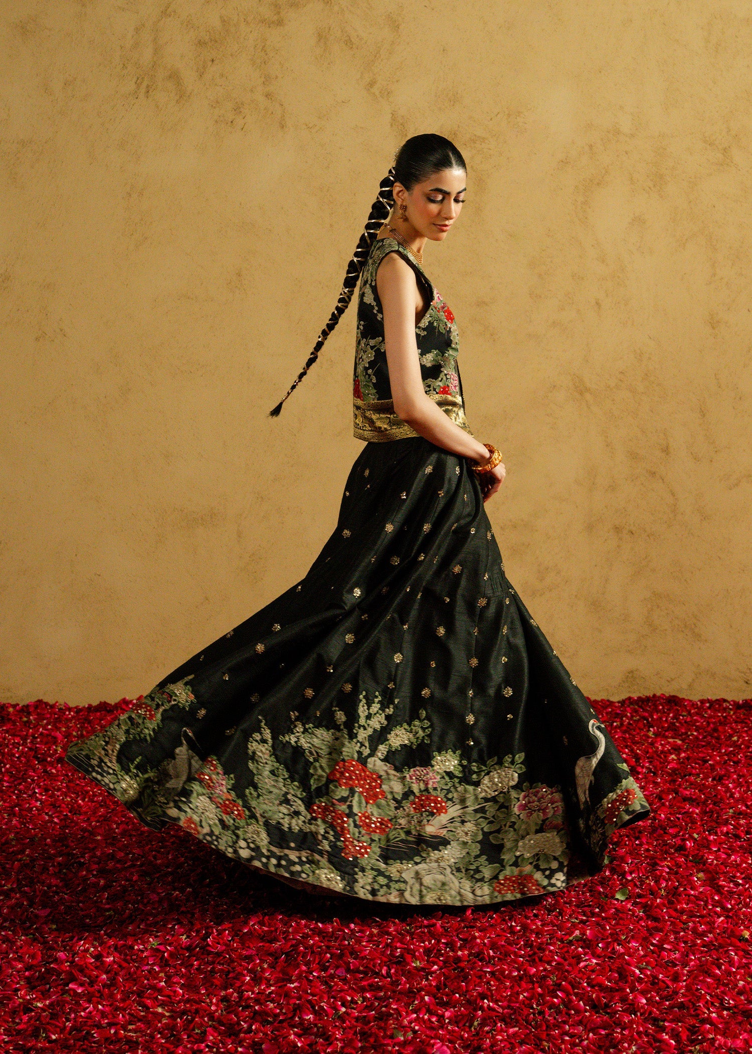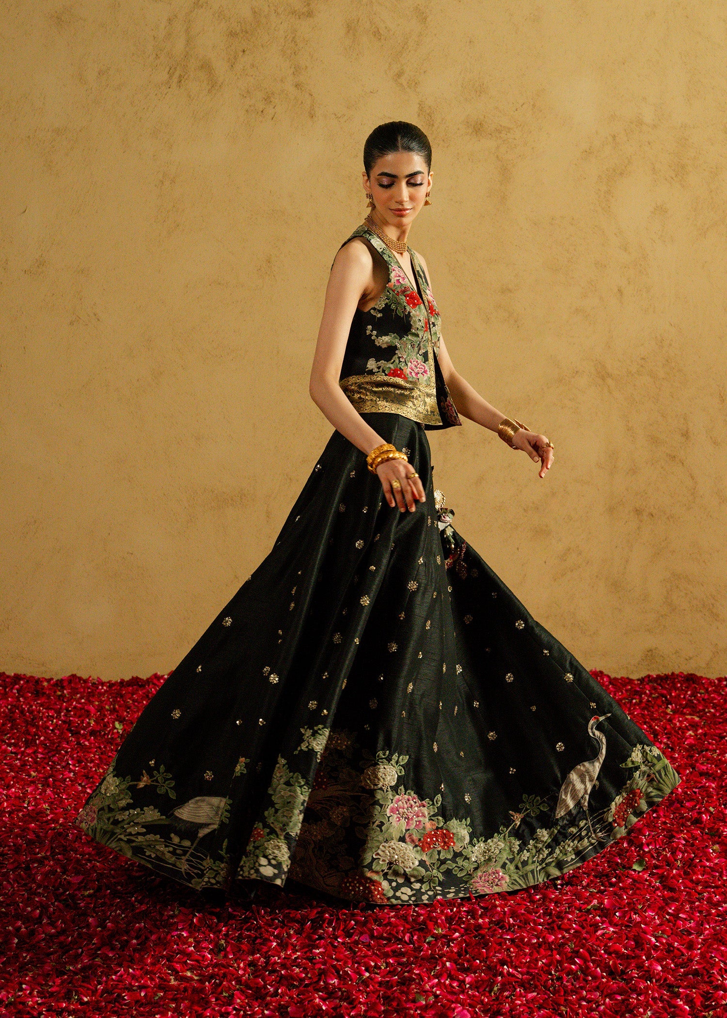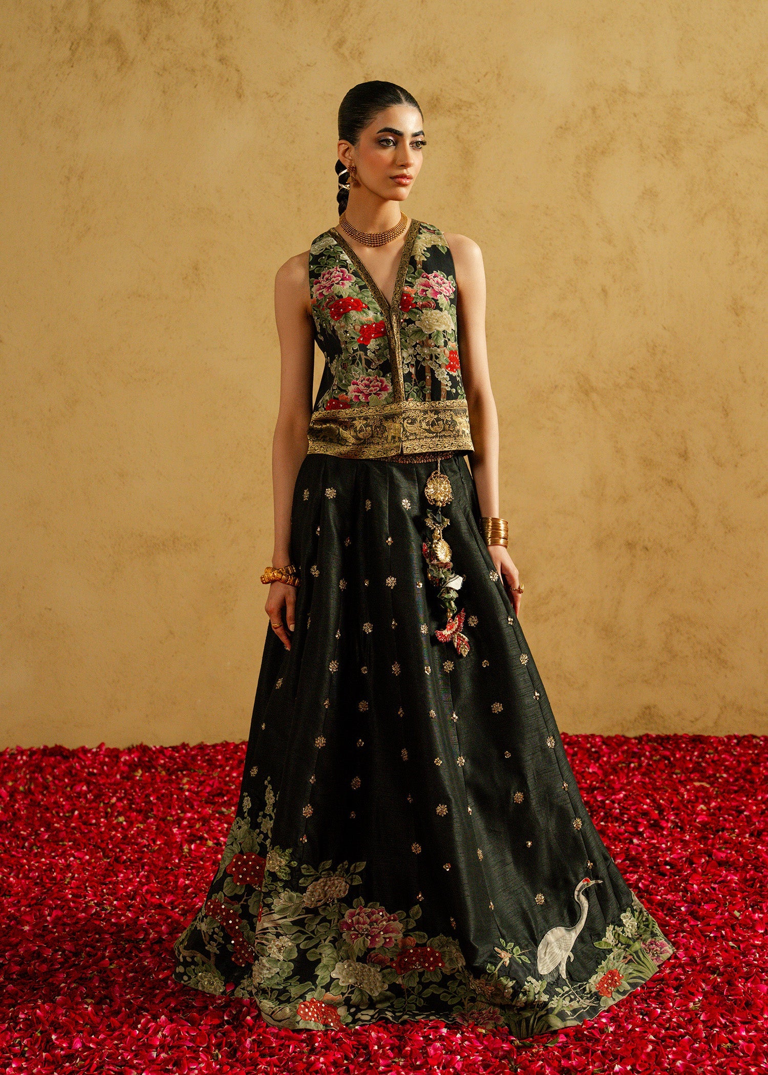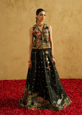 Mehrunissa, a regal black ensemble featuring a structured grip jacket paired with an Indian raw silk lehnga and blouse. Designed to reflect timeless grandeur, this silhouette balances tradition with contemporary finesse. From the richness of the fabric to the powerful jacket styling, every detail is crafted to make a lasting statement at weddings and evening festivities.