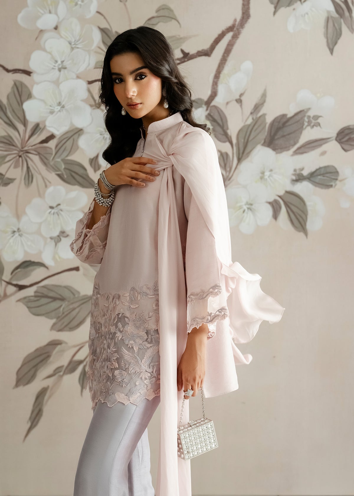 Crafted in luxurious Korean raw silk, the kurti and trousers reflect a poetic blend of femininity and refinement. A timeless luxury pret look for those who adore subtle romance in every stitch.