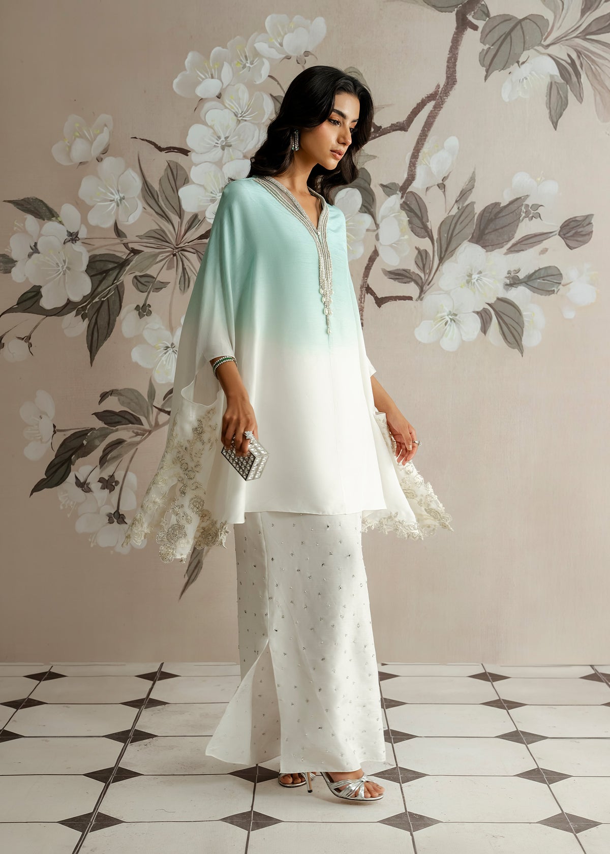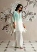 An aqua-hued masterpiece tailored in luxurious Korean raw silk. The kurti’s fluid silhouette and refined detailing exude effortless grace, making it a perfect pick for daytime festivities or serene evening gatherings. A look that breathes calm sophistication in every fold.