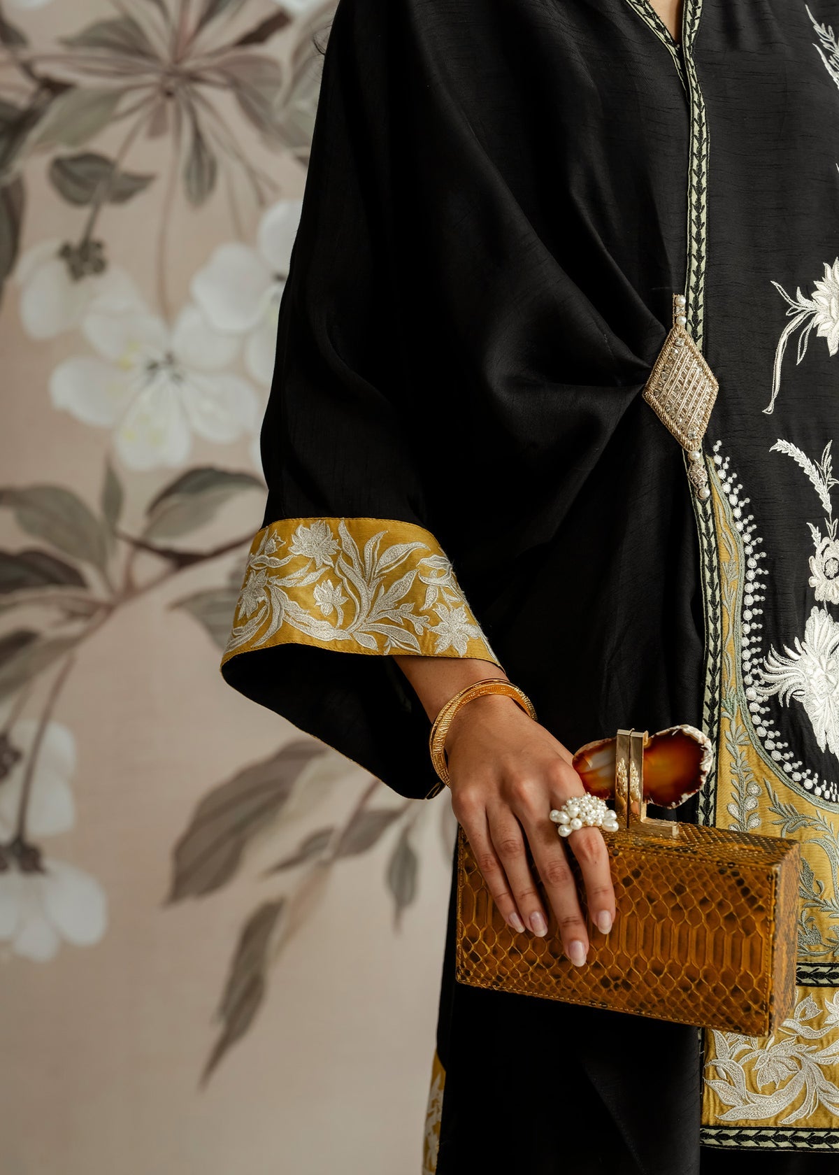 A timeless black ensemble crafted in plush Korean raw silk. The sleek kurti and tailored trousers exude understated charm, perfect for evenings where effortless elegance takes the spotlight.