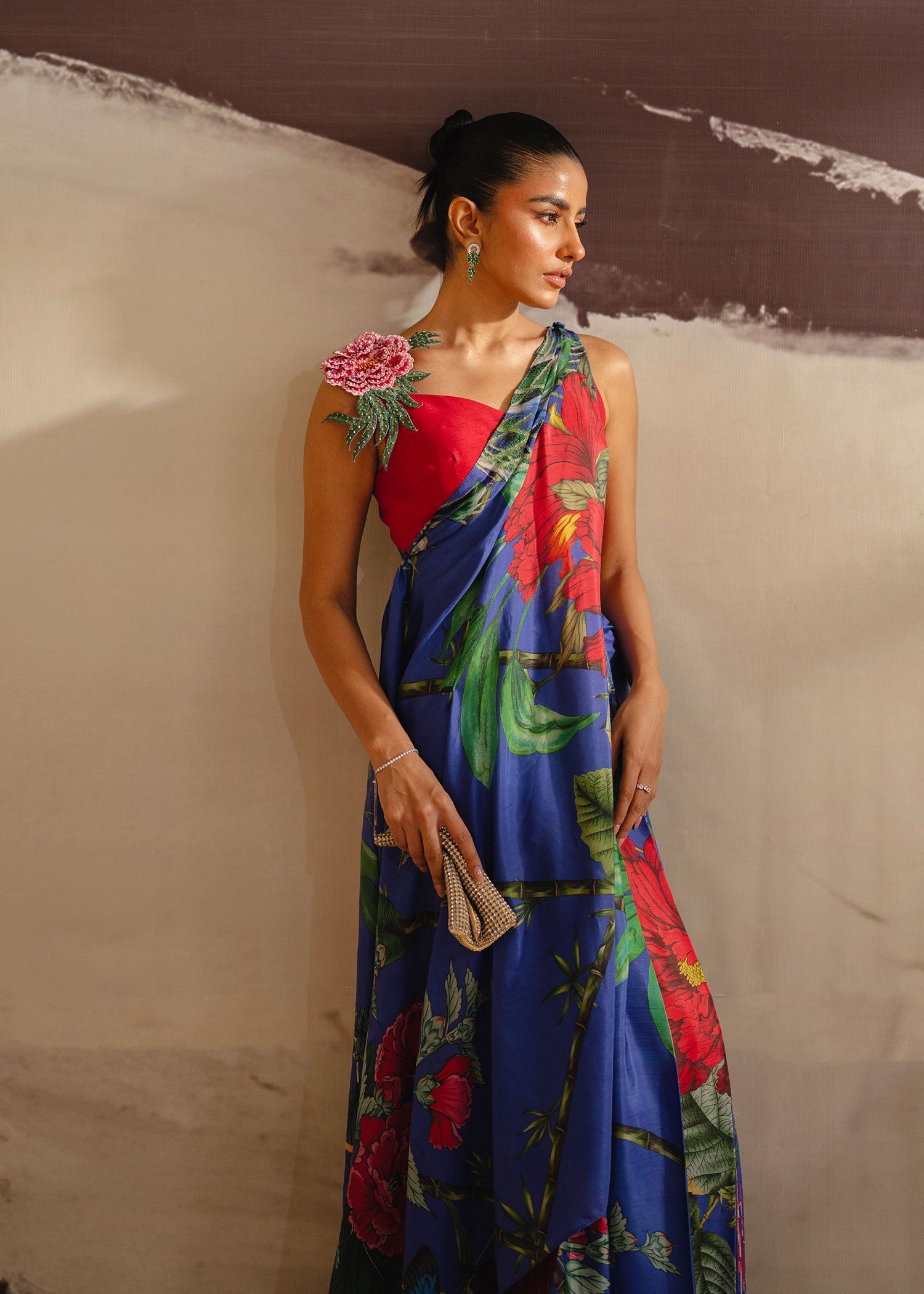 Embrace classic sophistication with Bold Breeze, a stunning red and blue saree that effortlessly combines tradition with modernity. The intricately designed blouse, made from luxurious Korean raw silk, pairs perfectly with the flowing medium silk saree, creating a striking contrast. The grip silk petticoat adds structure to complete this bold yet graceful ensemble.