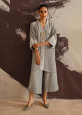 Radiate elegance with Grey Jewel, a sophisticated kurti in a classic grey hue. Crafted from lightweight georgette chiffon, the shirt drapes beautifully, while the raw silk trousers add a touch of luxurious refinement. This ensemble is perfect for those who seek a balance of simplicity and grace, making it an ideal choice for both day and evening wear.