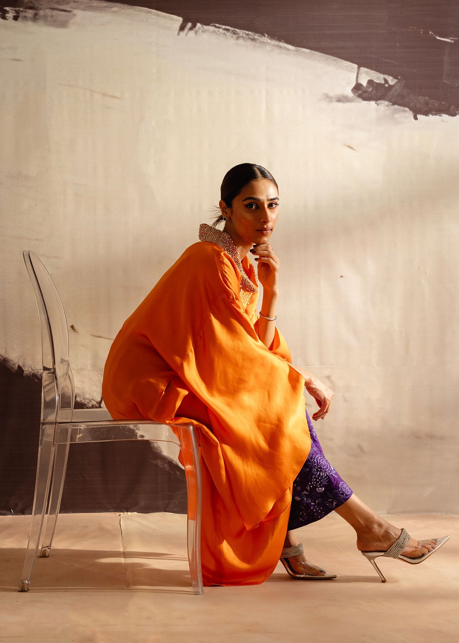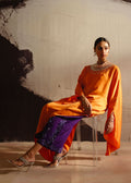 Infuse your wardrobe with vibrant hues with Mandarin Glow, a long shirt crafted from luxurious grip silk in striking orange. The rich tone is beautifully complemented by tailored purple Korean raw silk trousers, creating a refined yet bold ensemble. Perfect for festive occasions, this outfit radiates charm and elegance.