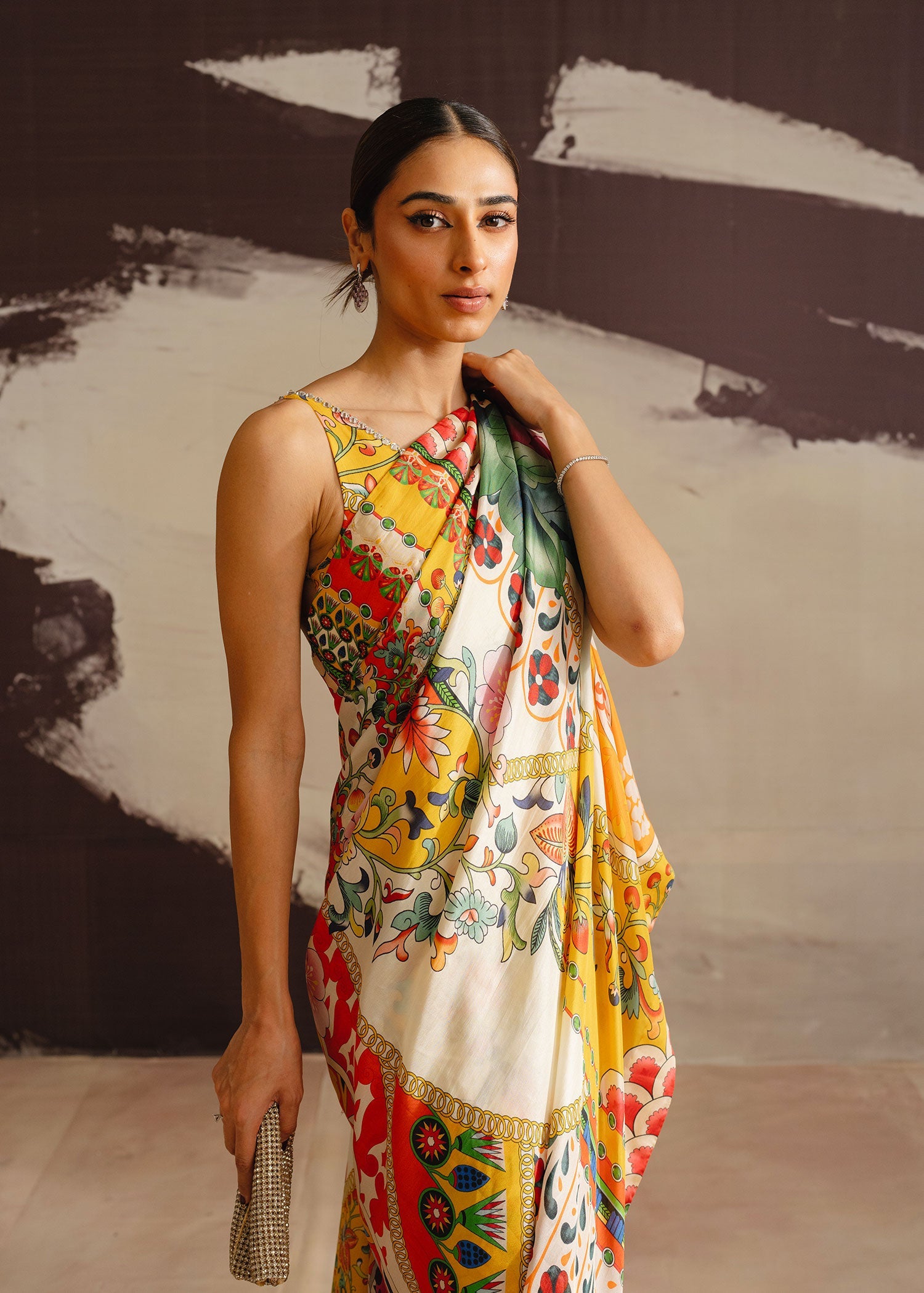 Step into the spotlight with Tangerine Dance, a multi colour printed saree that exudes vibrant energy and elegance. The luxurious medium silk blouse and saree create a seamless flow of colour and texture, while the grip silk petticoat adds volume and poise. This lively yet sophisticated ensemble is perfect for making a statement at any festive occasion.