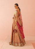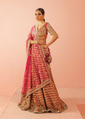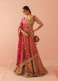 Make a statement in red with this panni worked lehnga featuring heavy hand embellishment on the border and belt. The choli is intricately hand worked as is the contrasting, pink dupatta.