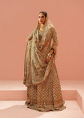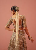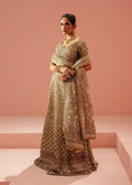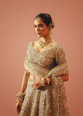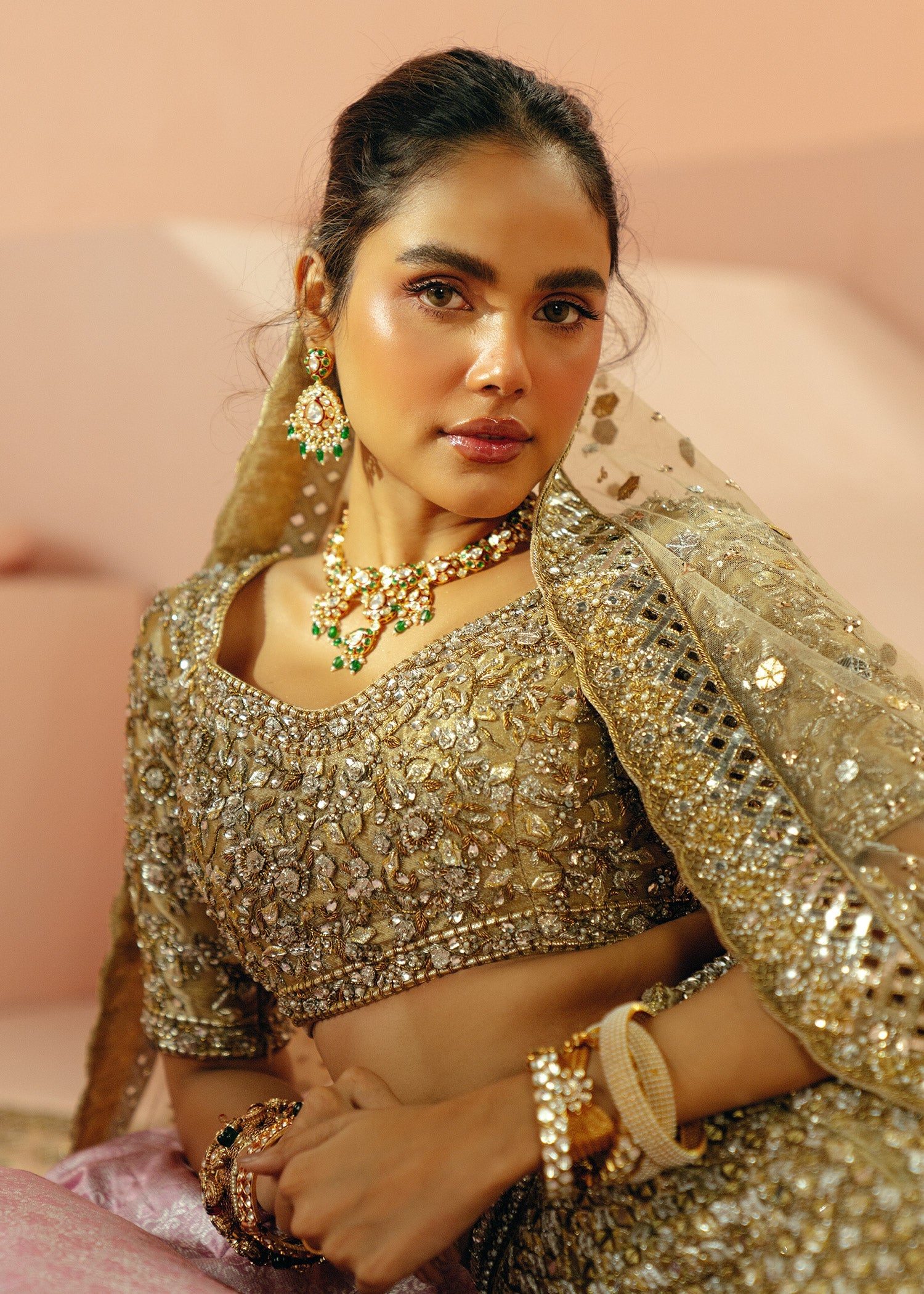 You will shine like Gold in the air of Summer in Baranh! A traditional lehnga, choli and dupatta crafted on tissue and net is intricately hand worked in gradations using mirror work, zardozi, gota, pearls and diamantes. The dupatta is crafted on net with a delicately scaled mukesh jaal and zardozi, thread work, kundan and bethki.
