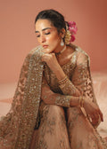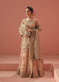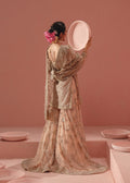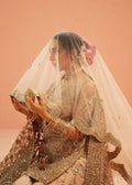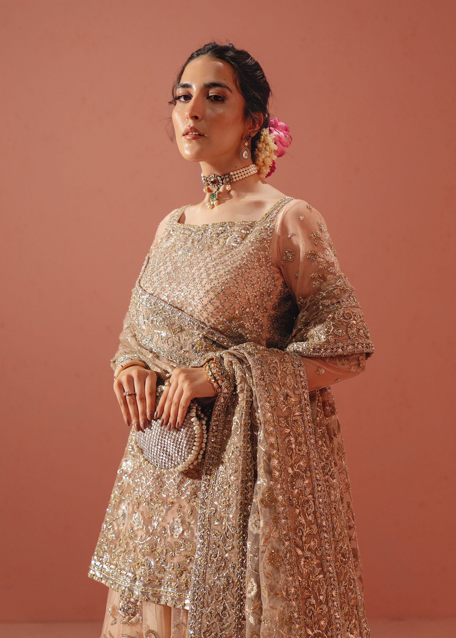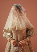 Signature Mahgul elegance shines through the shirt, sharara, dupatta and veil crafted entirely on french net. The intricately hand worked sparkles against the backdrop of a worked sharara. The dupatta is a masterpiece of craft featuring inctricate embroidery and hand embellishment throughout. Add some flare & drama with the fully hand embellished veil.