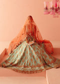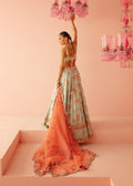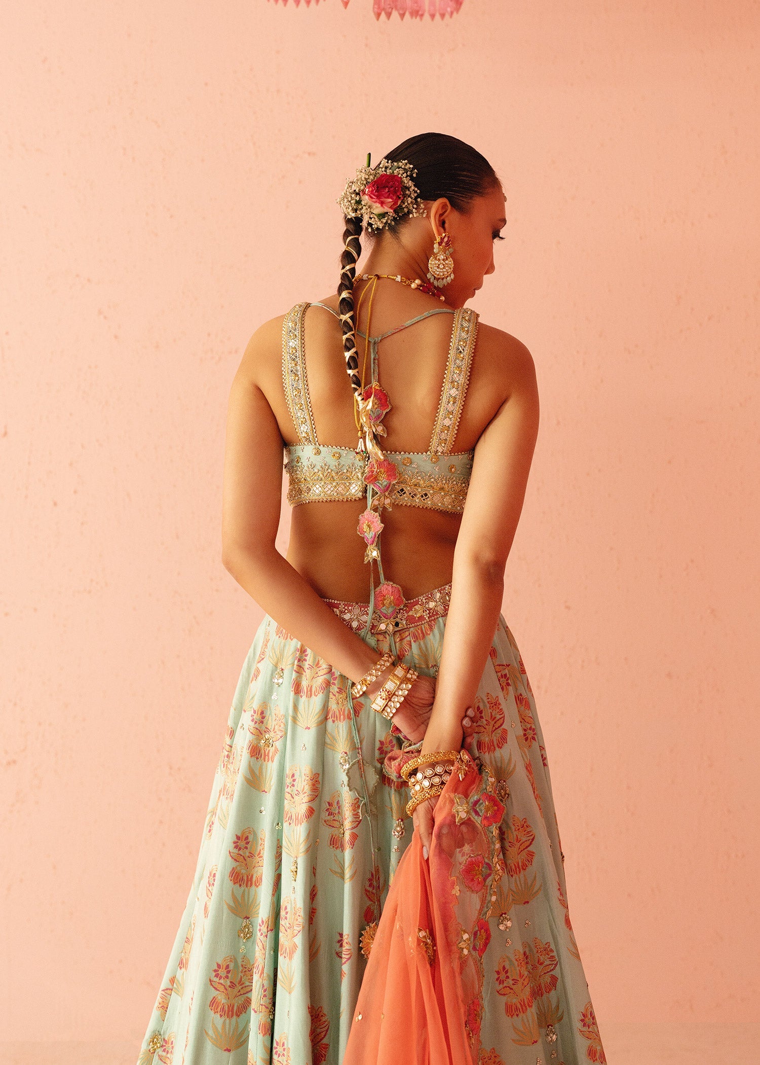 Fun, playful and intricate define this aqua silk, screen printed ensemble with a coral dupatta! The outfit is entirely hand embellished with mirror work, gota, stones, zardozi and sequins.