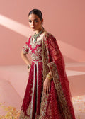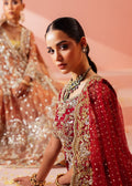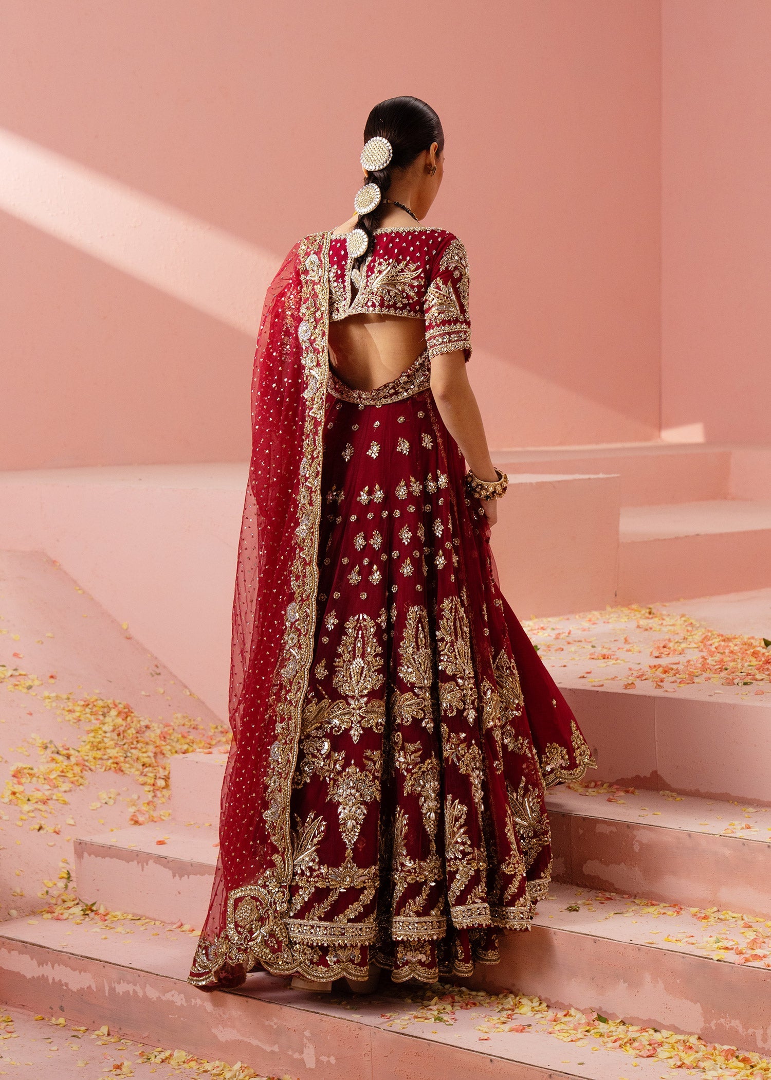 A breathtaking bridal ensemble in traditional red, featuring an intricately hand-embellished shirt, dupatta, and lehenga. Adorned with the opulence of mukesh, zardozi, pearls, swarovski crystals, gota, delicate thread work, and sitara, this outfit embodies timeless elegance and unmatched craftsmanship, perfect for the bride who wishes to make a regal statement on her special day.