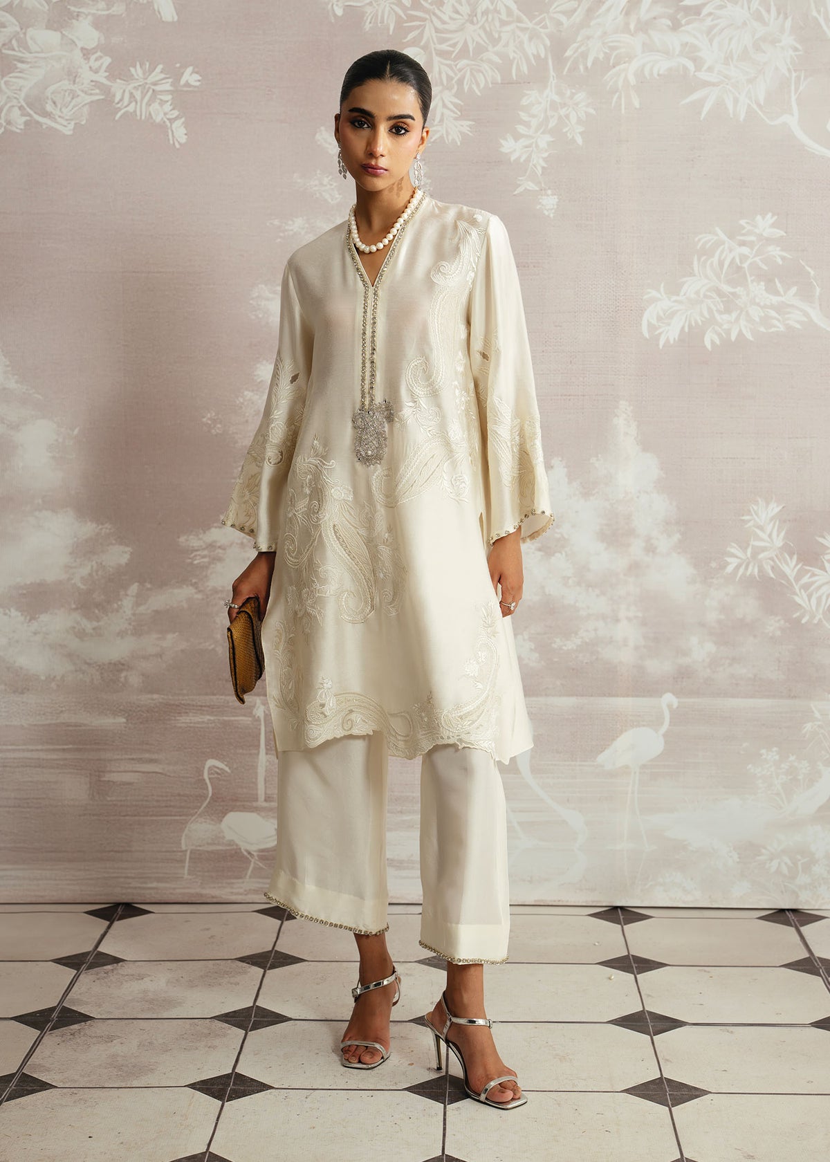 A vision of timeless elegance, Safa is rendered in a soft ivory palette, exuding understated luxury. Crafted with a karandi silk shirt and paired with rich raw silk trousers, the ensemble is elevated by a delicately hand-embellished neckline. Finished with a flowing chiffon plain spray dupatta, this Luxury Pret look is designed for graceful moments where refinement speaks volumes.