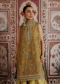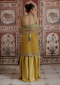 Illuminate your wardrobe with this radiant yellow long shirt crafted from delicate organza. The shirt is beautifully complemented by an intricately designed jamawar gharara, adding a touch of richness and flair. A matching organza dupatta flows gracefully, enhancing the overall elegance of the ensemble.