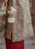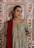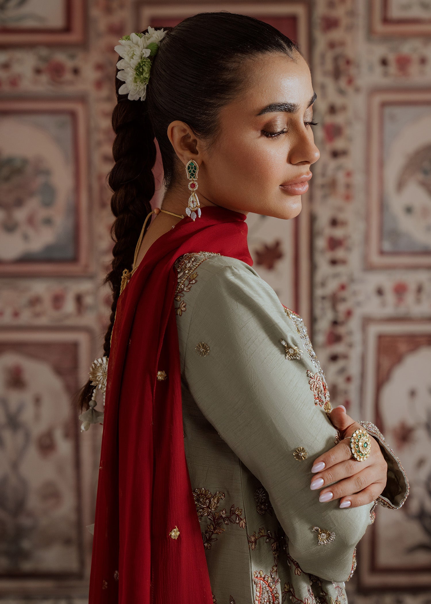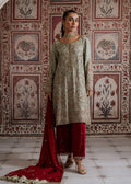 Embrace sophistication with this long shirt crafted from luxurious raw silk in a serene sage green. Paired with matching raw silk trousers, this ensemble is complemented by a delicate chiffon dupatta, offering a perfect blend of elegance and comfort for any occasion.
