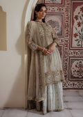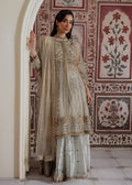 Radiate elegance in this stunning long shirt crafted from delicate net, featuring a captivating mint green hue. The ensemble is beautifully complemented by a plain tissue sharara, showcasing graceful flow and movement. A matching net dupatta adds an ethereal touch, making this outfit perfect for festive occasions.